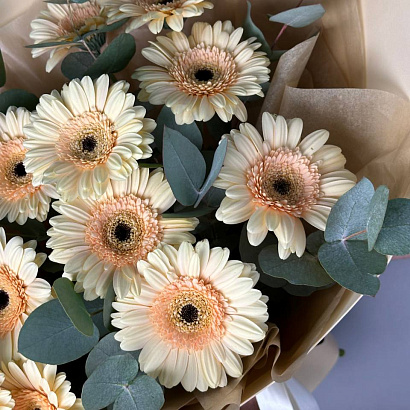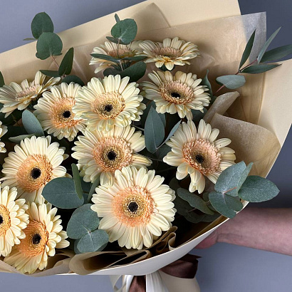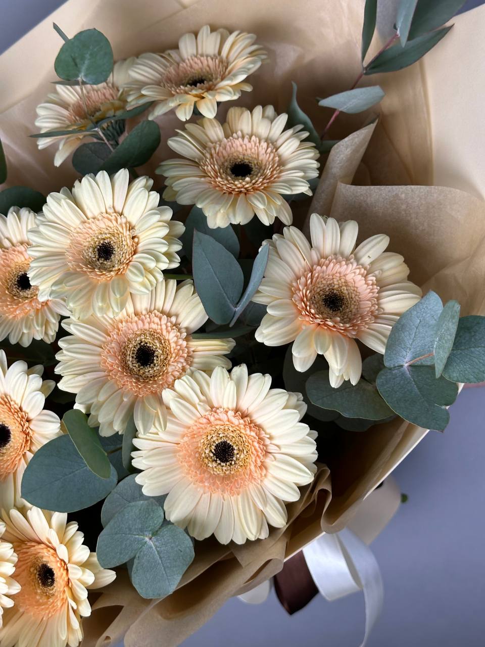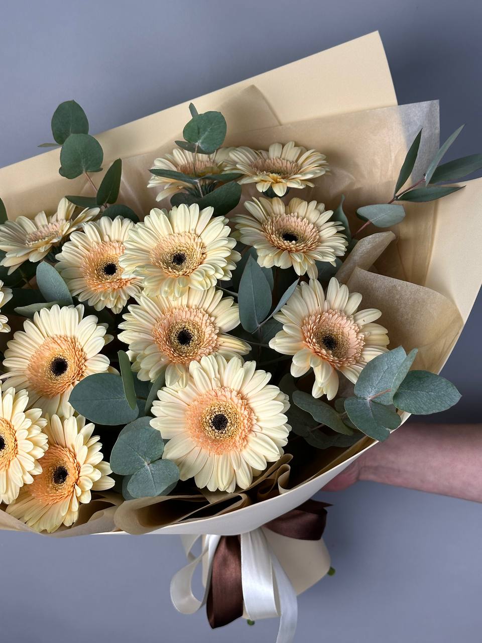 Букет из песочных гербер с веточками эвкалипта. Элегантная и сдержанная композиция, с любовью собранная нашими флористами для любого повода.
