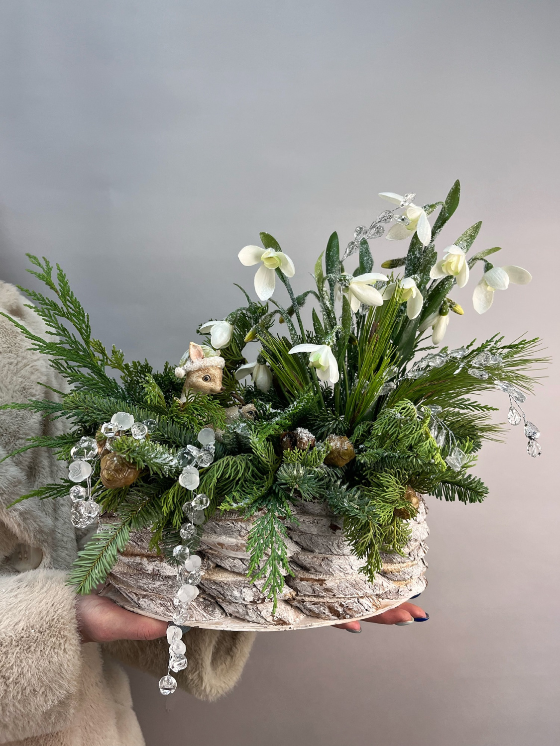 Красивый зимний презент для праздничного настроения! Сказочная елочная композиция с нежными первоцветами и корой дерева украсит дом, офис или праздничный стол.