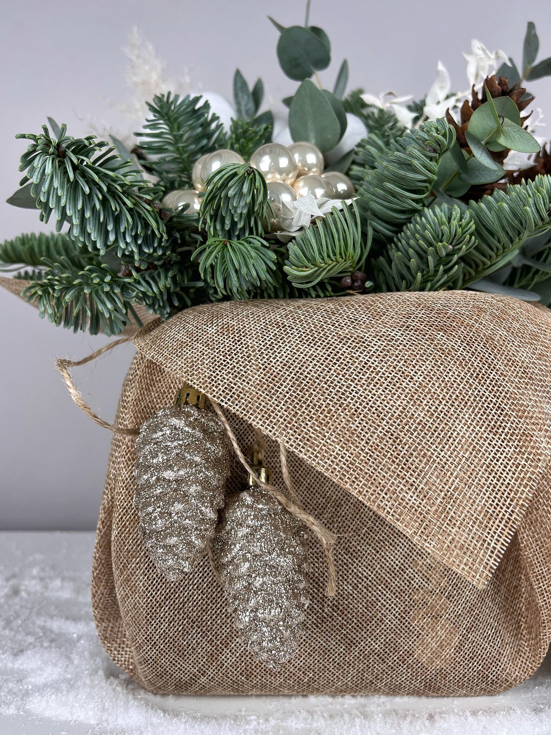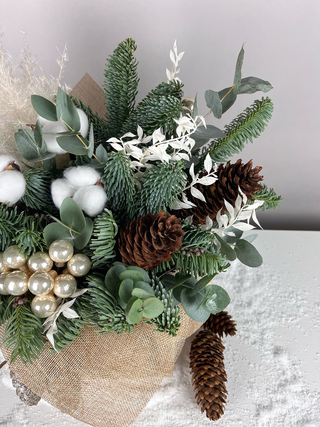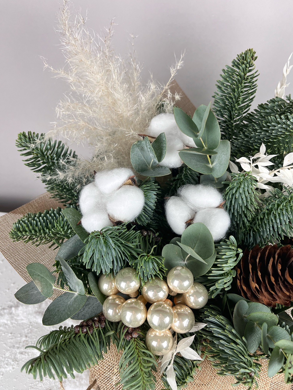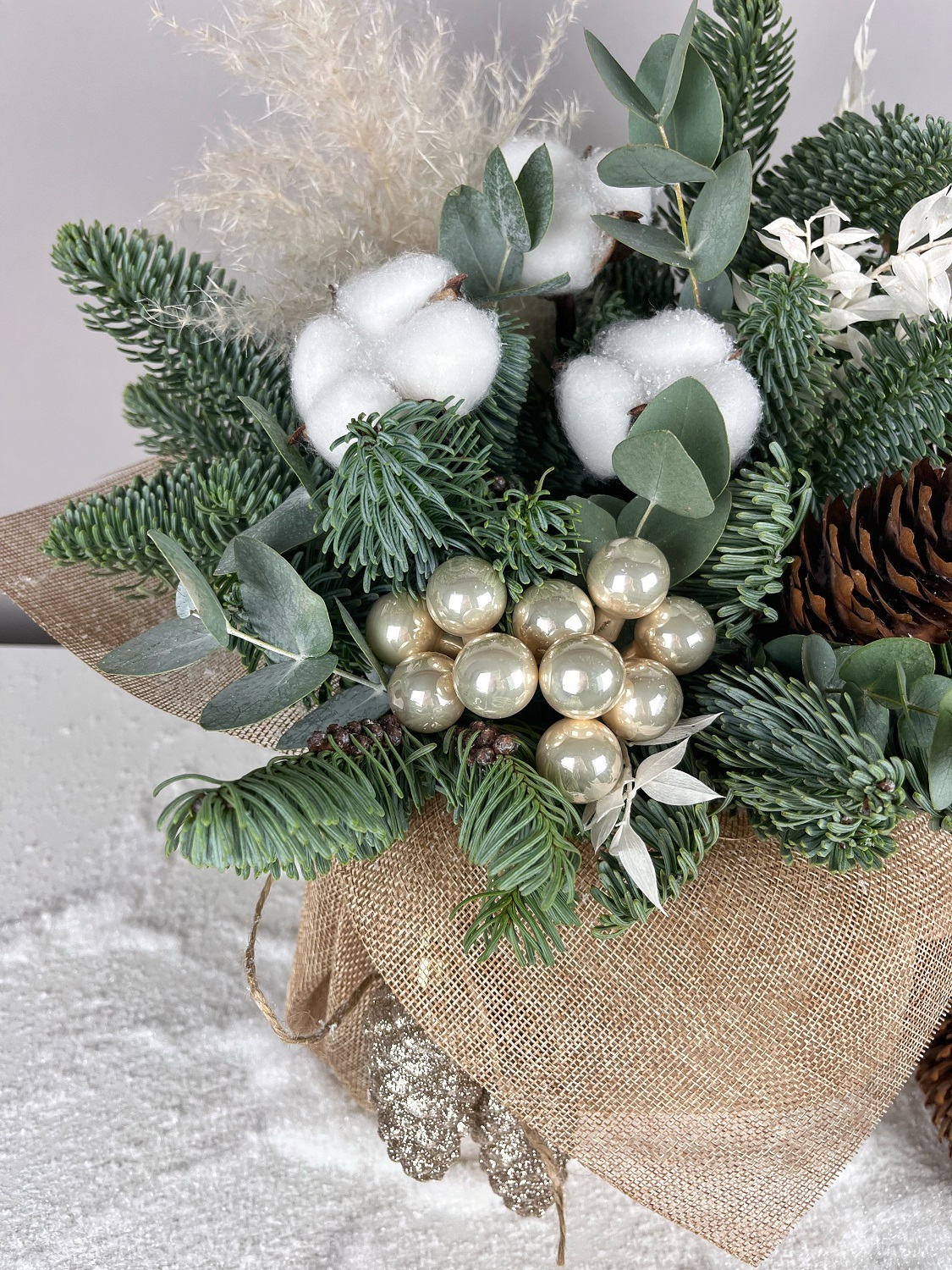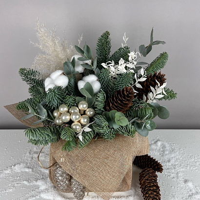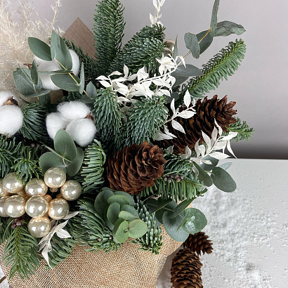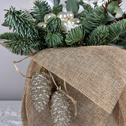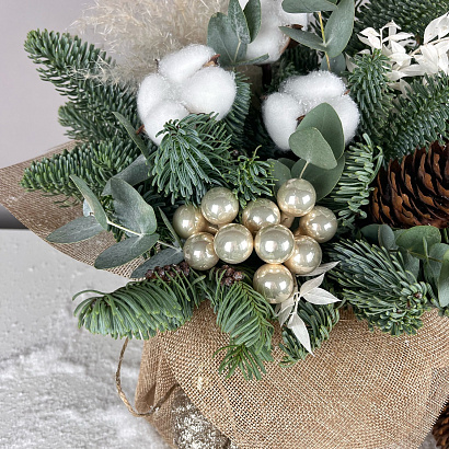 Елочная композиция Мешочек с хлопком отлично украсит праздничный стол, офис или ресепшен.