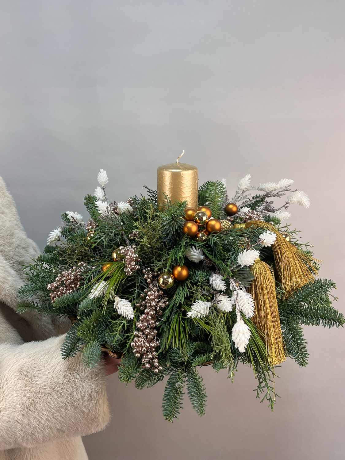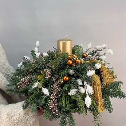 Подарите новогоднее настроение! Стильная композиция из нобилиса, новогоднего декора и свечи создаст волшебное настроение на новогодних праздниках.