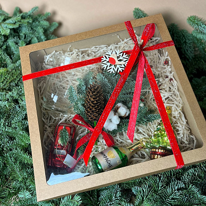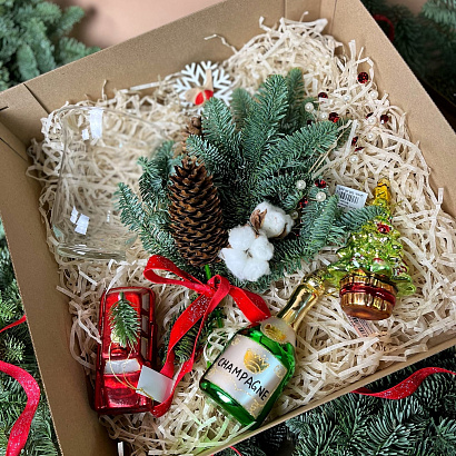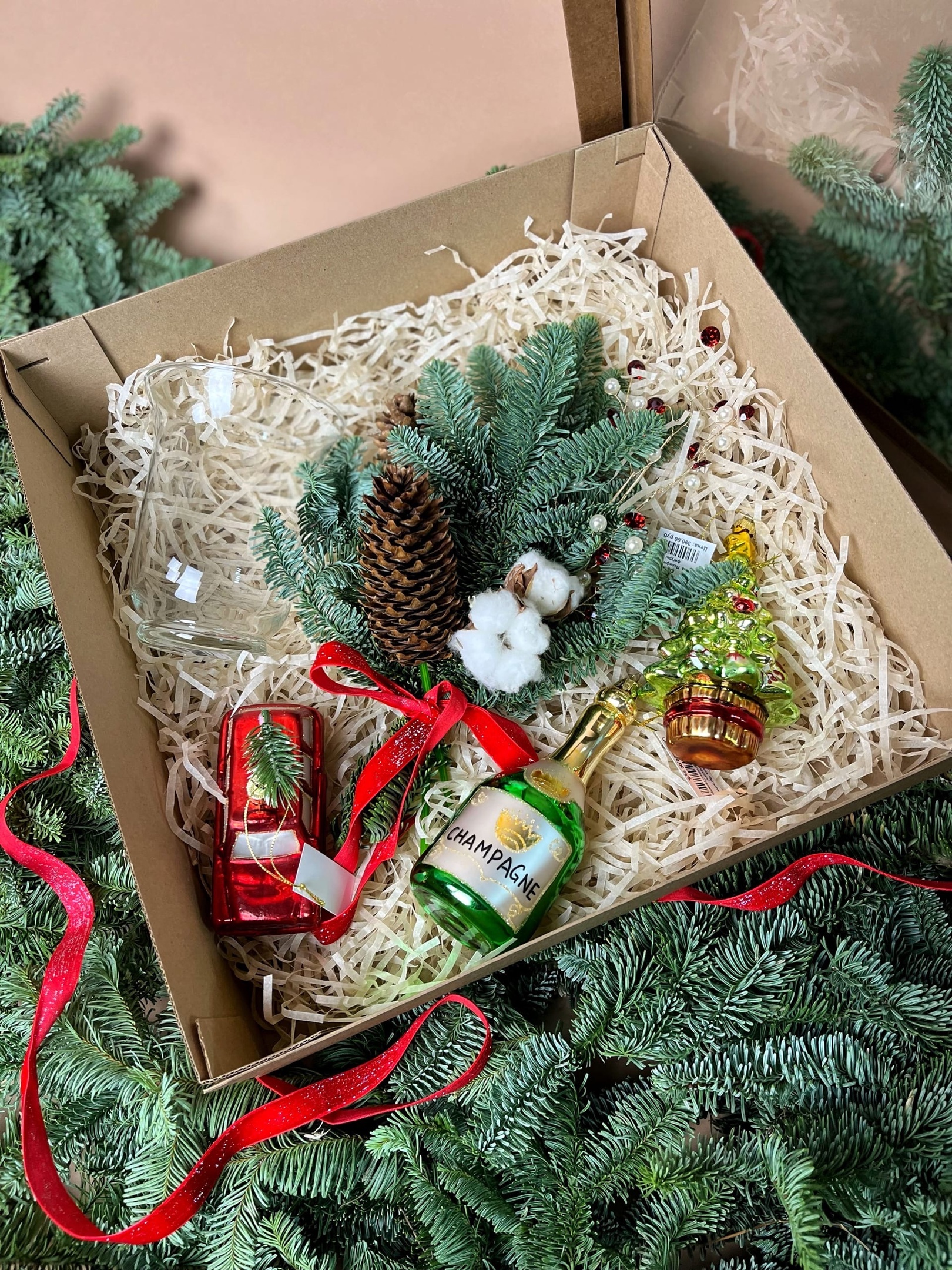 Подарочная коробочка для поднятия новогоднего настроения вашим близким и любимым. Коробочка с наполнителем, букетом из нобилиса, вазой и тремя елочными игрушками.