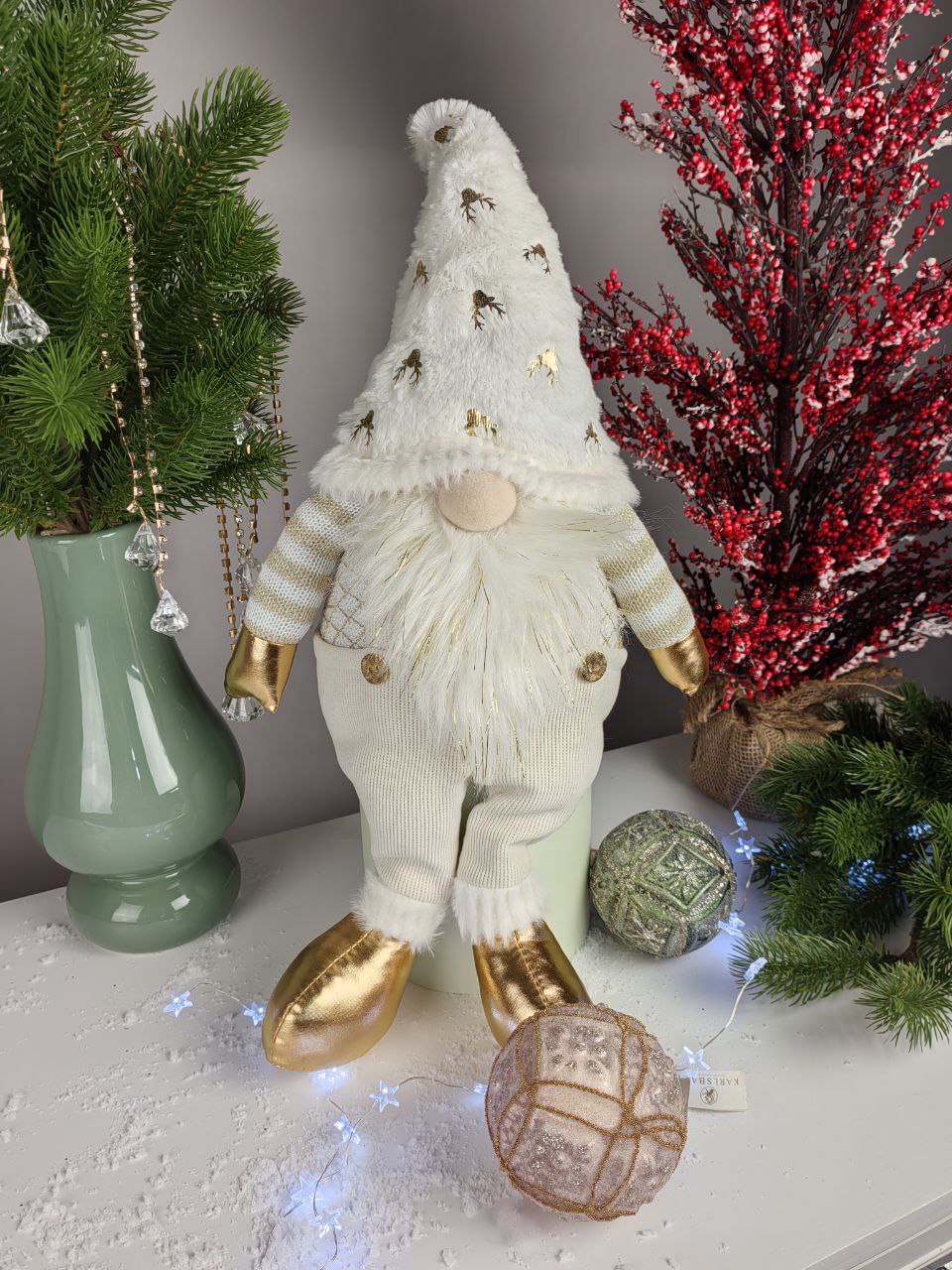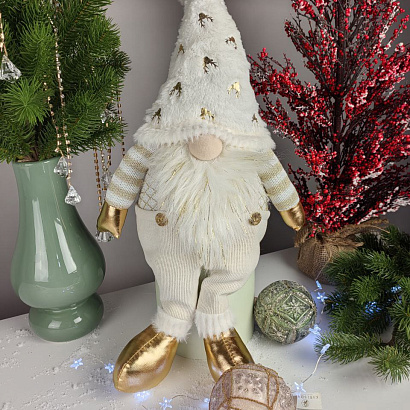 Новогодний гном в зимнем костюме и золотых ботинках для праздничного настроения! Закажите подарки, сувениры, новогодний декор и зимние букеты с ароматной елкой с доставкой на дом от сети салонов Амелия.