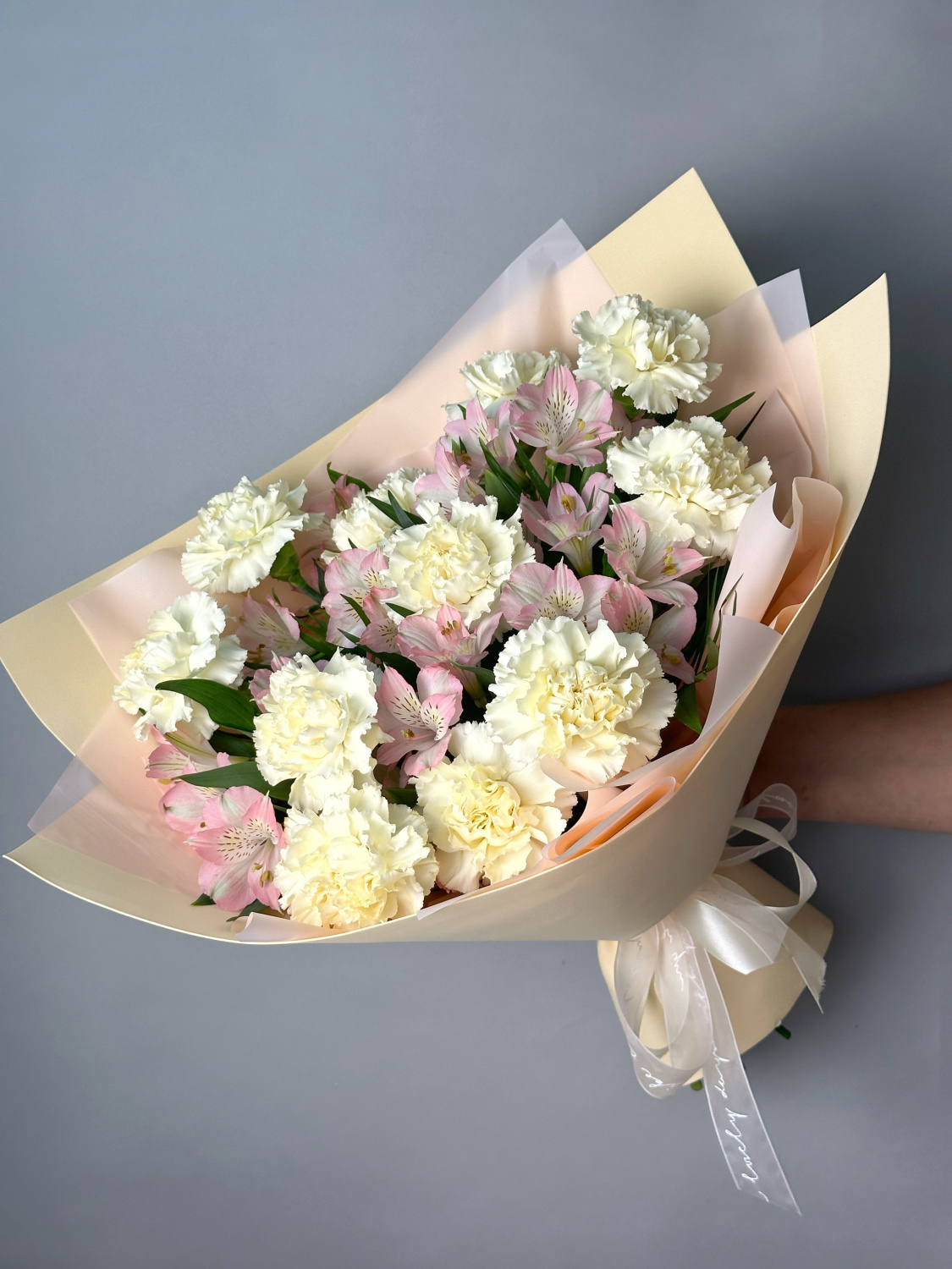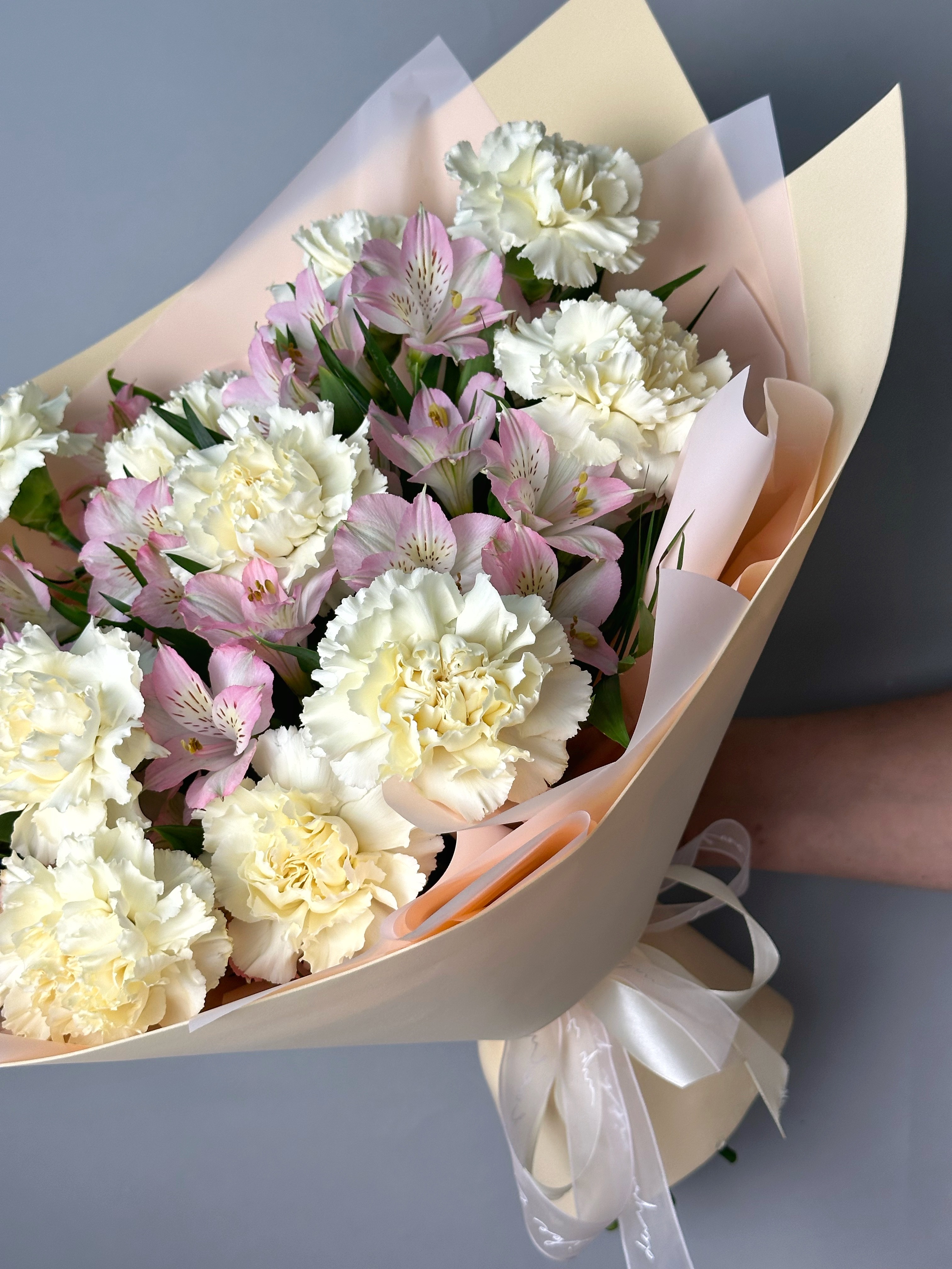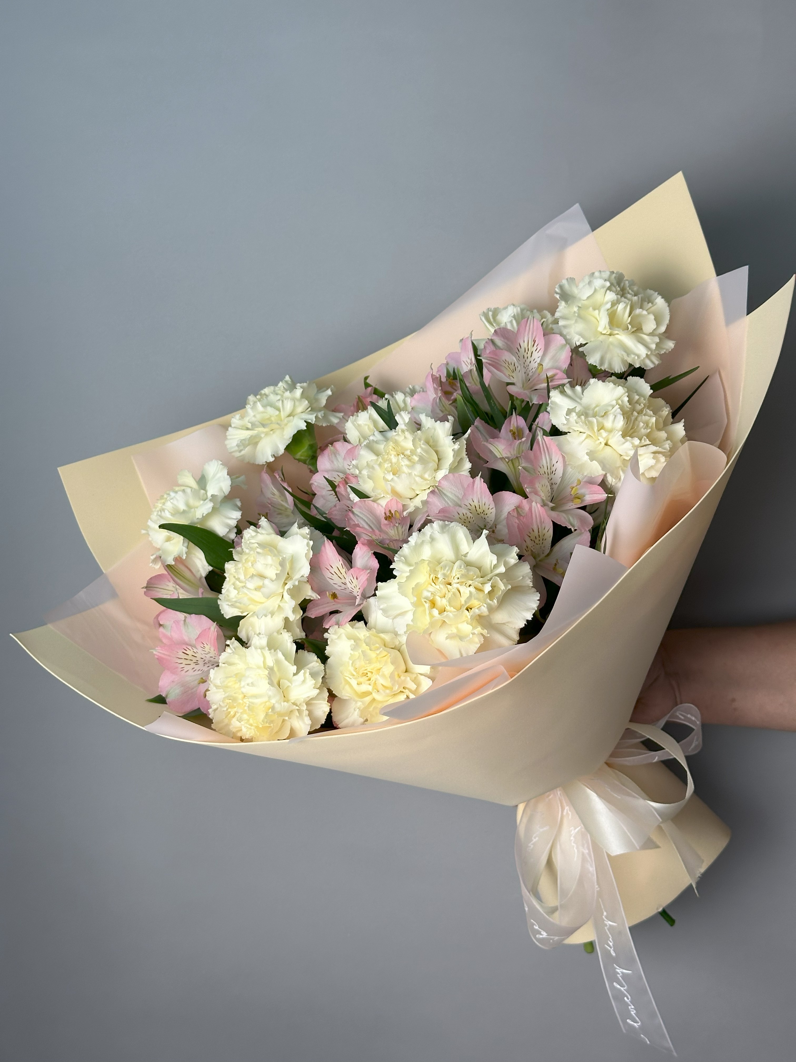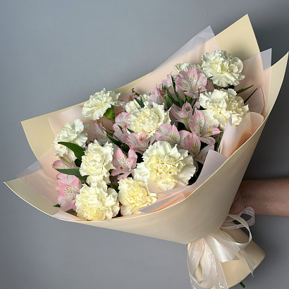 Букет из сортовых гвоздик кремового цвета с нежными альстромериями и зеленью. Изысканный и трепетный знак внимания для близких и любимых.