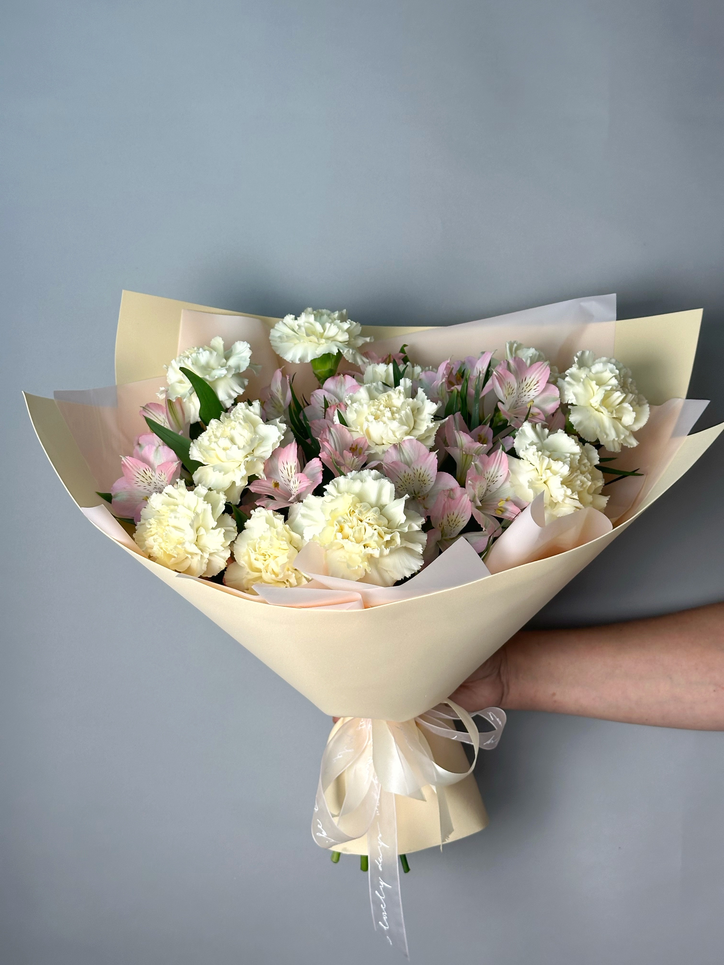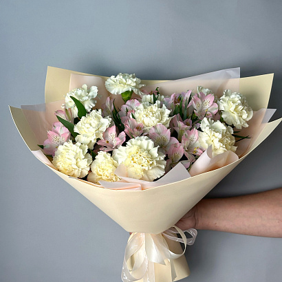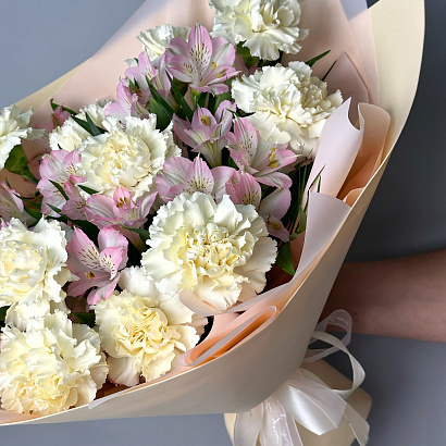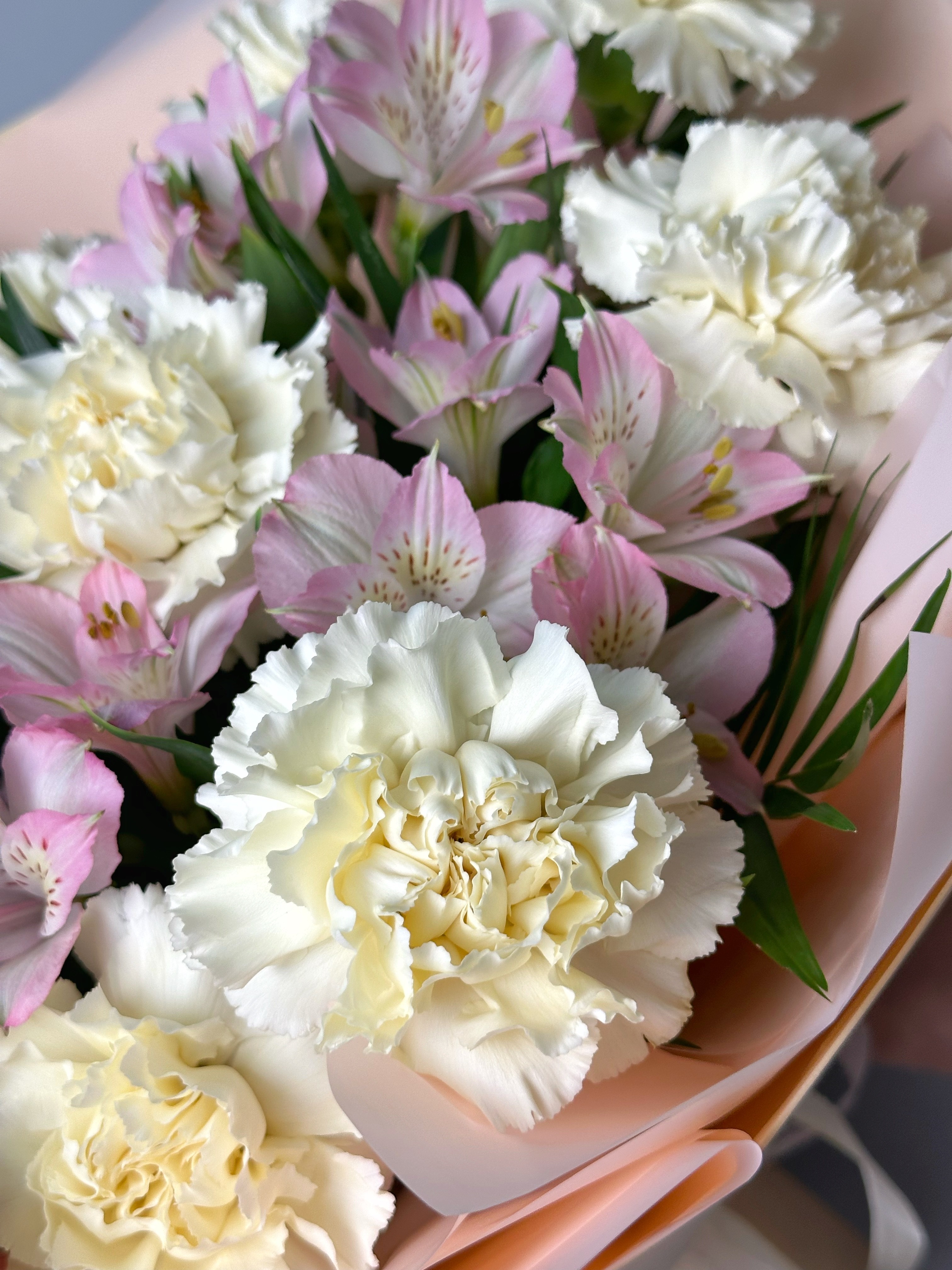 Букет из сортовых гвоздик кремового цвета с нежными альстромериями и зеленью. Изысканный и трепетный знак внимания для близких и любимых.