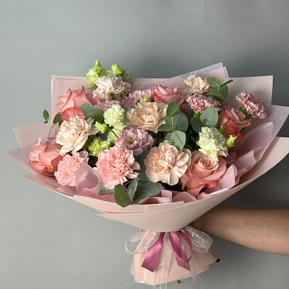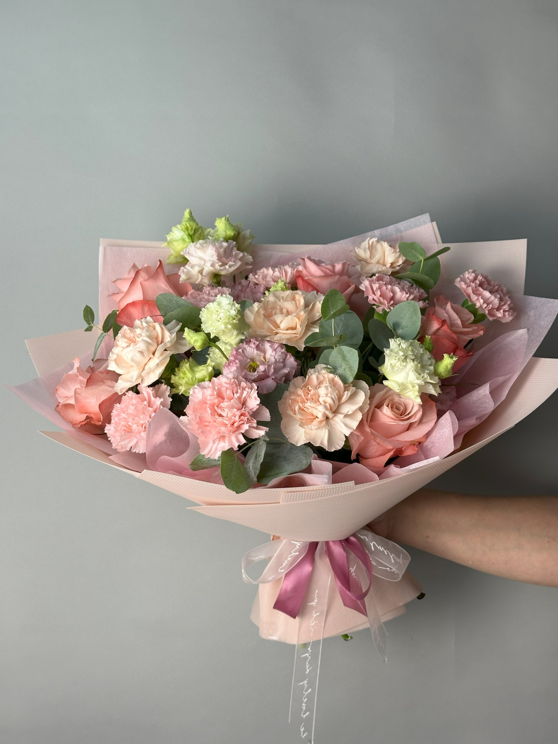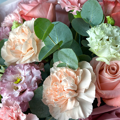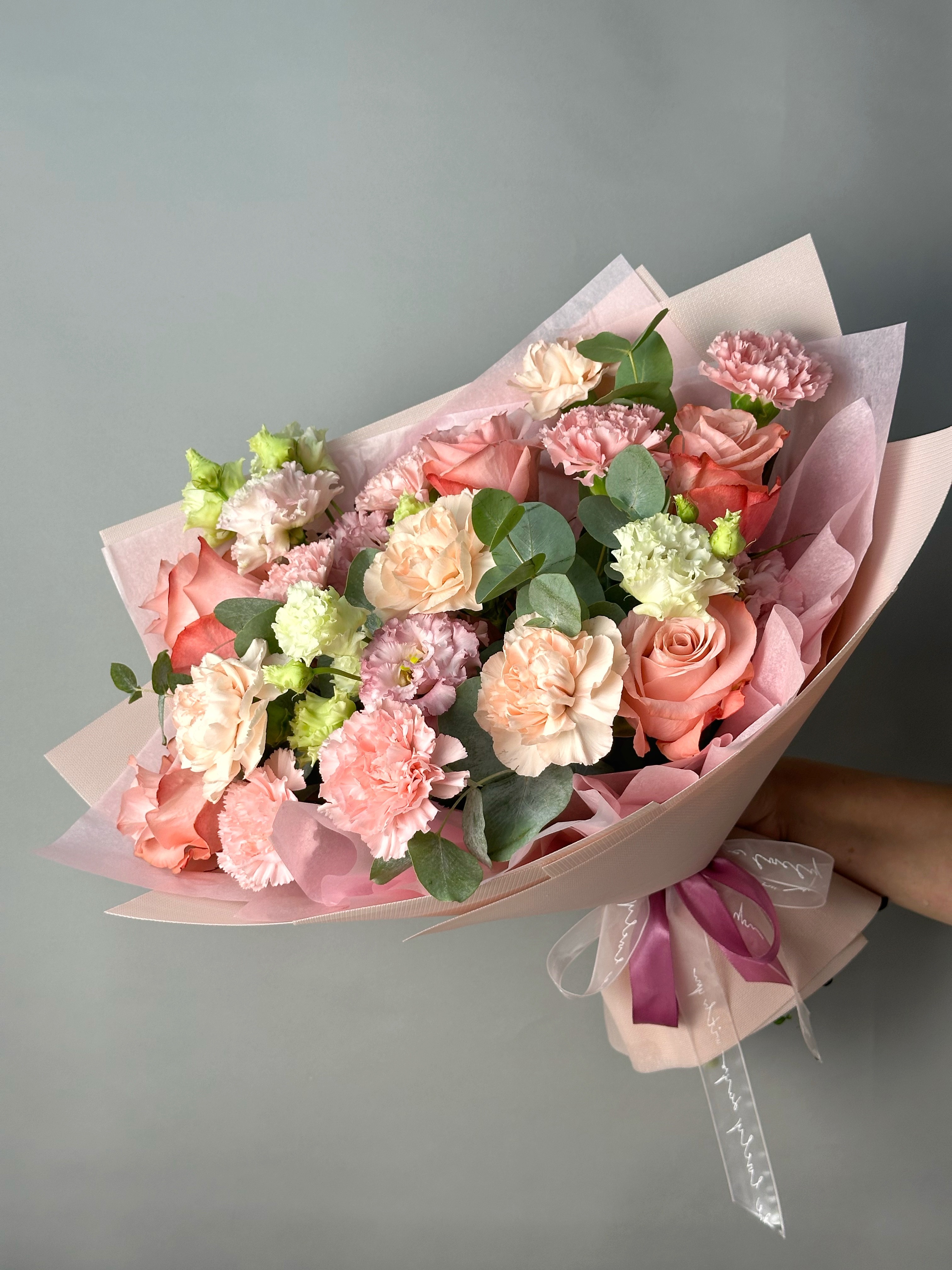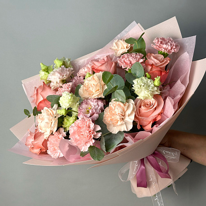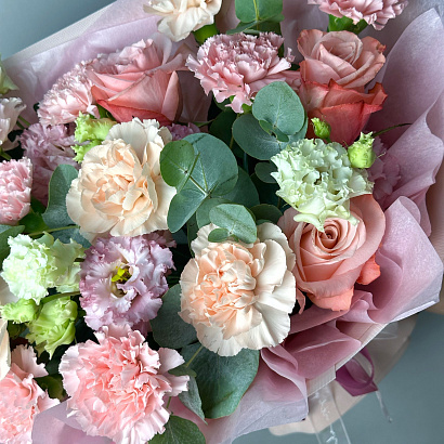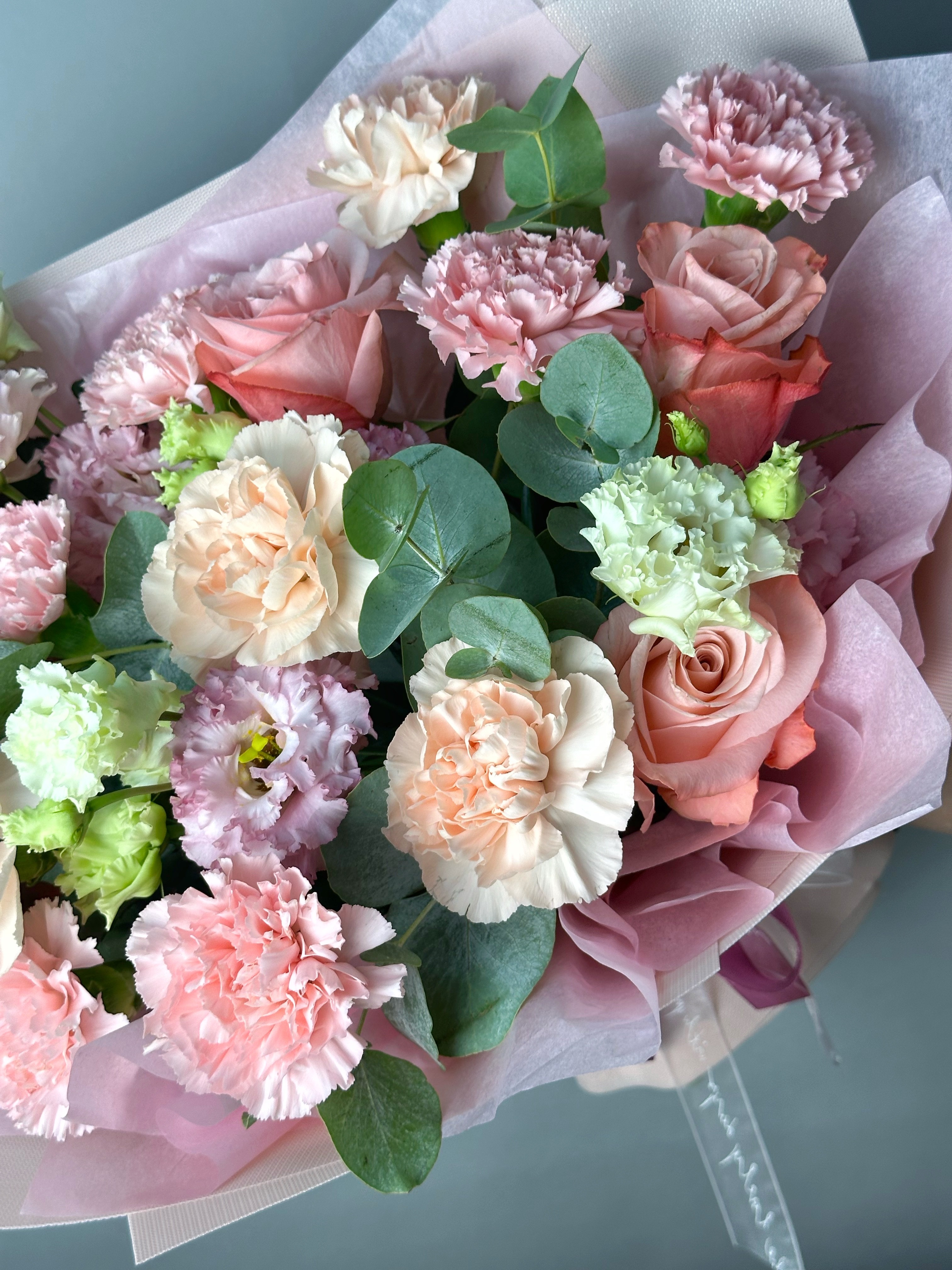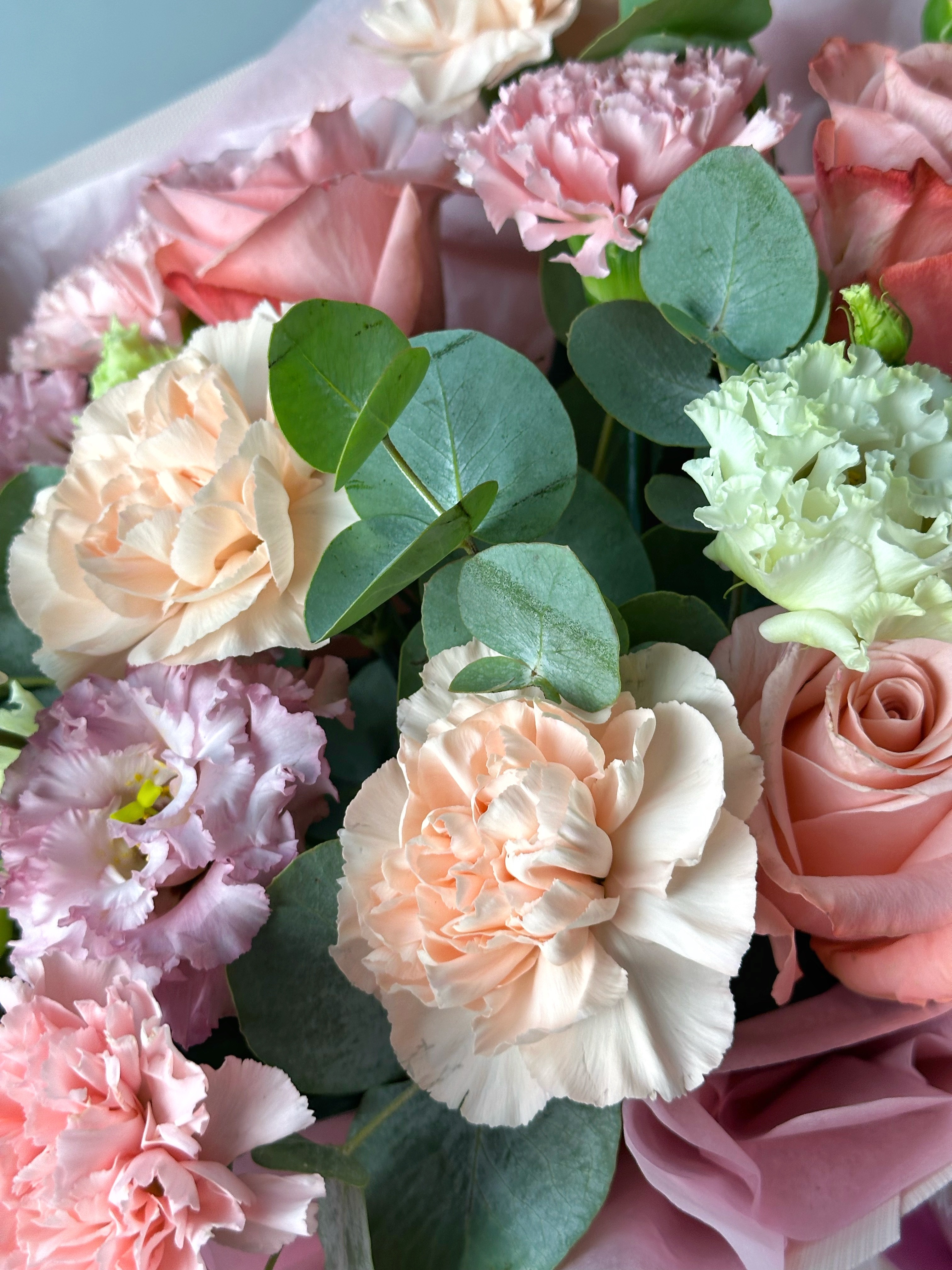 Нежный стильный букет, собранный со вкусом и любовью к цветам, станет лучшим презентом по любому поводу. Гвоздики и розы, эустома и веточки эвкалипта. Пышный букет вместо тысячи слов.