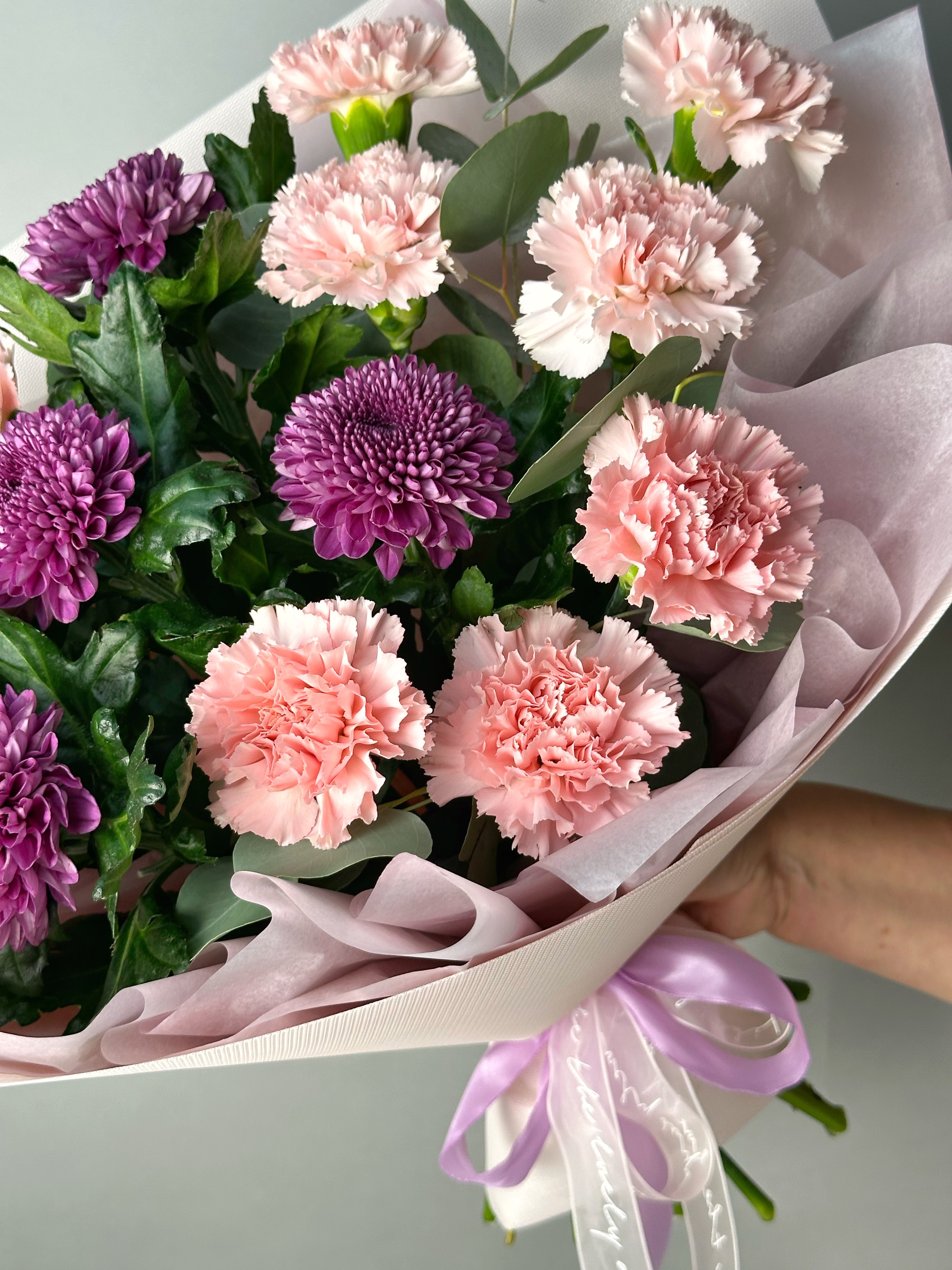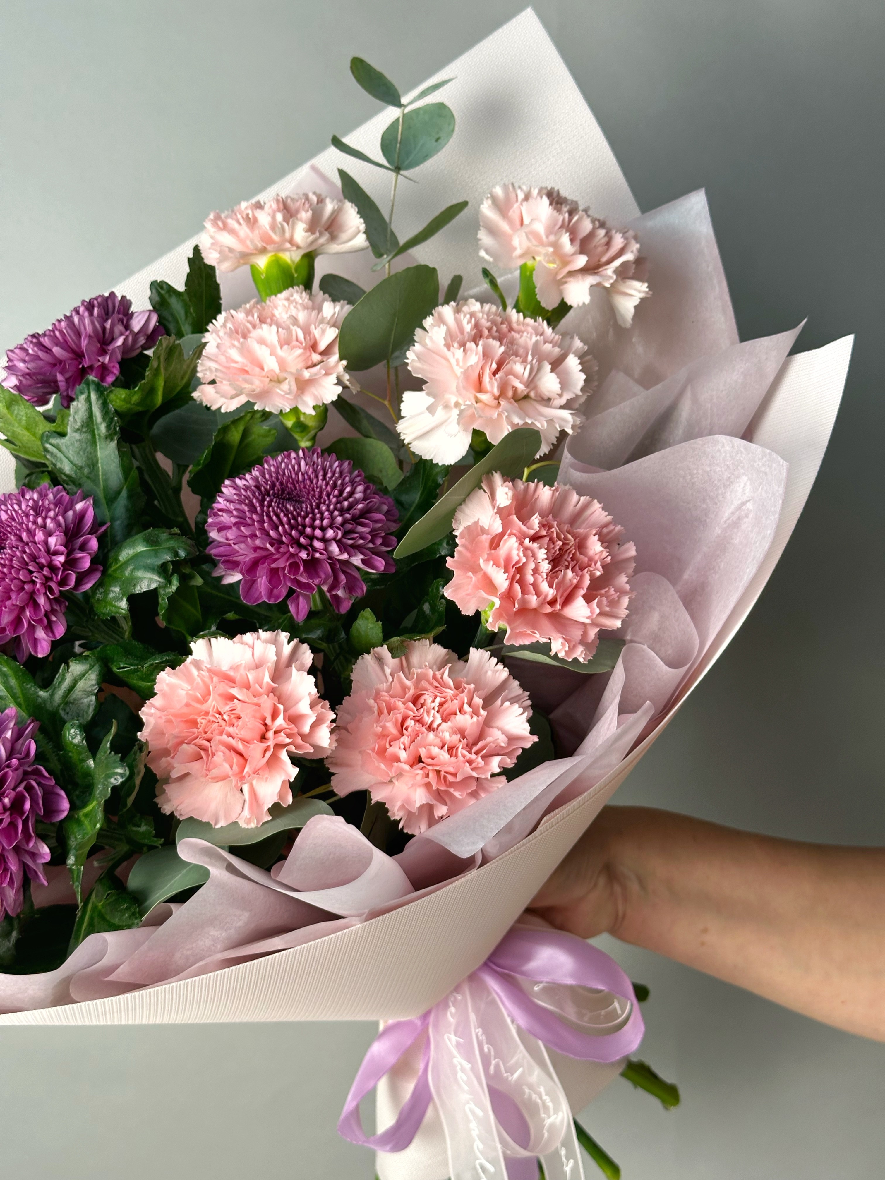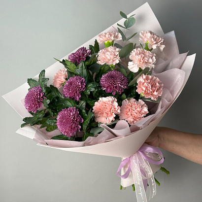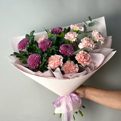 Притягательный букет из ярких хризантем и нежных гвоздик, оформленный эвкалиптом. Прекрасный презент, который украсит любой праздник!