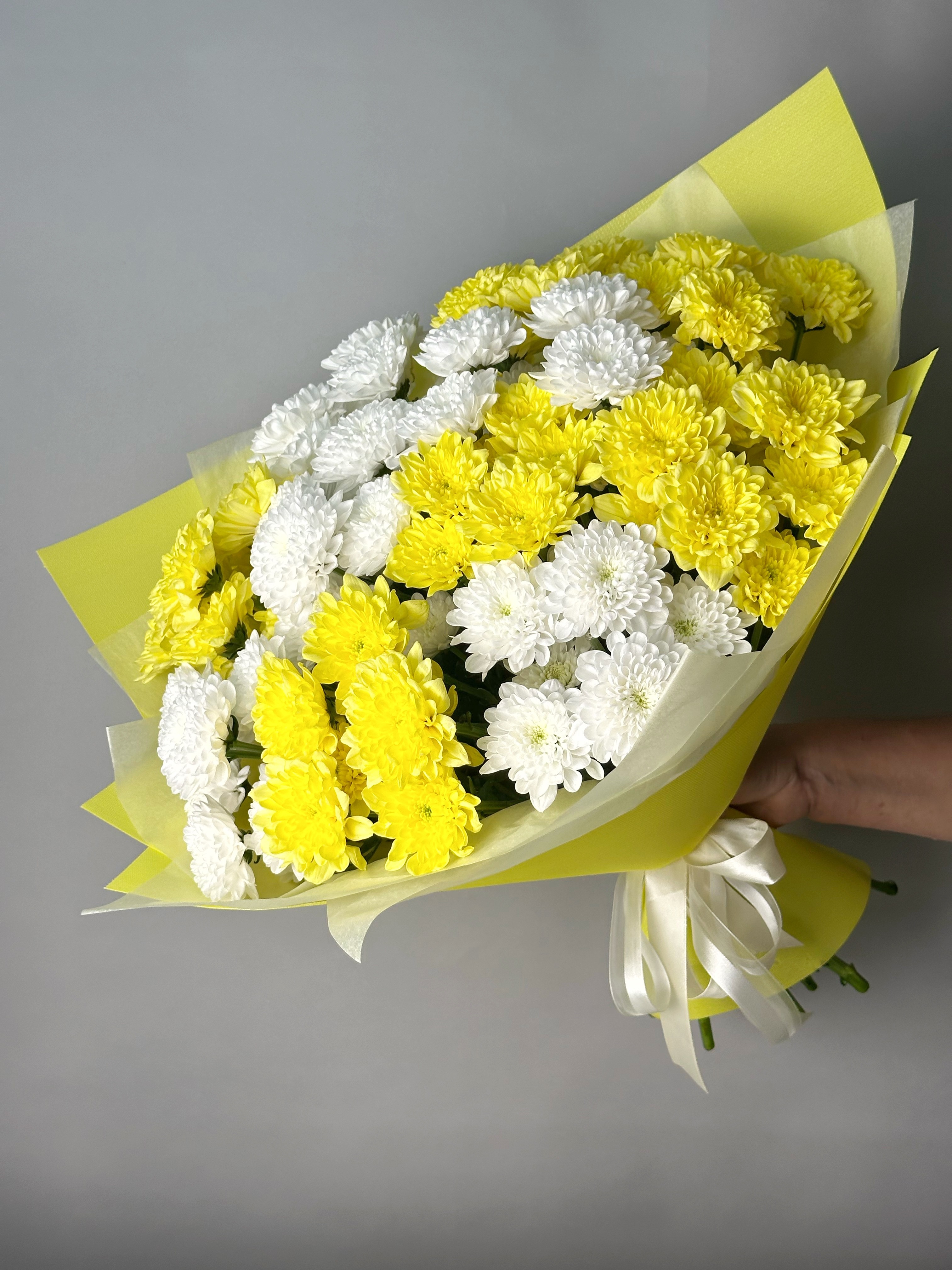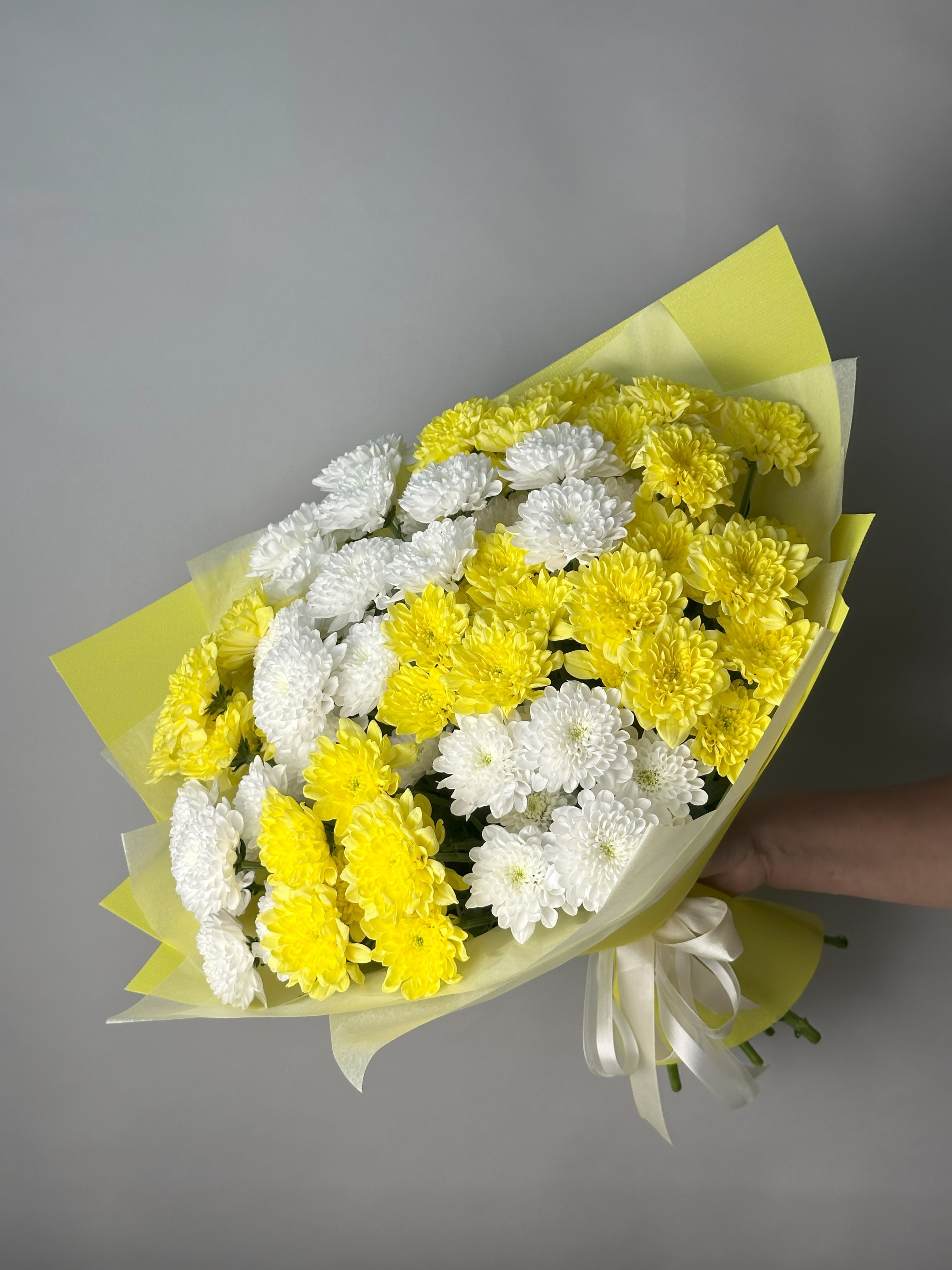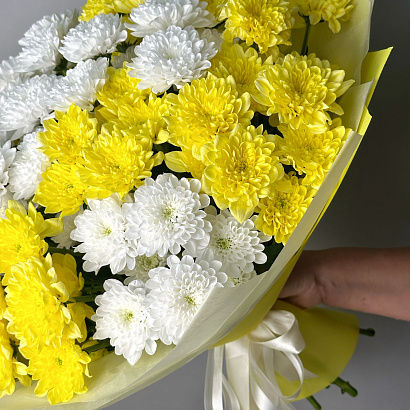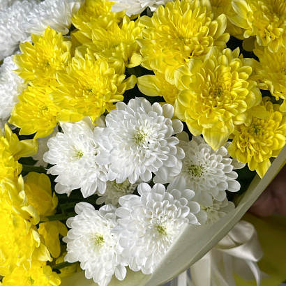 Пышный и солнечный букет из белых и желтых хризантем - настоящий привет теплого лета. Дарите цветы на праздник и просто так!