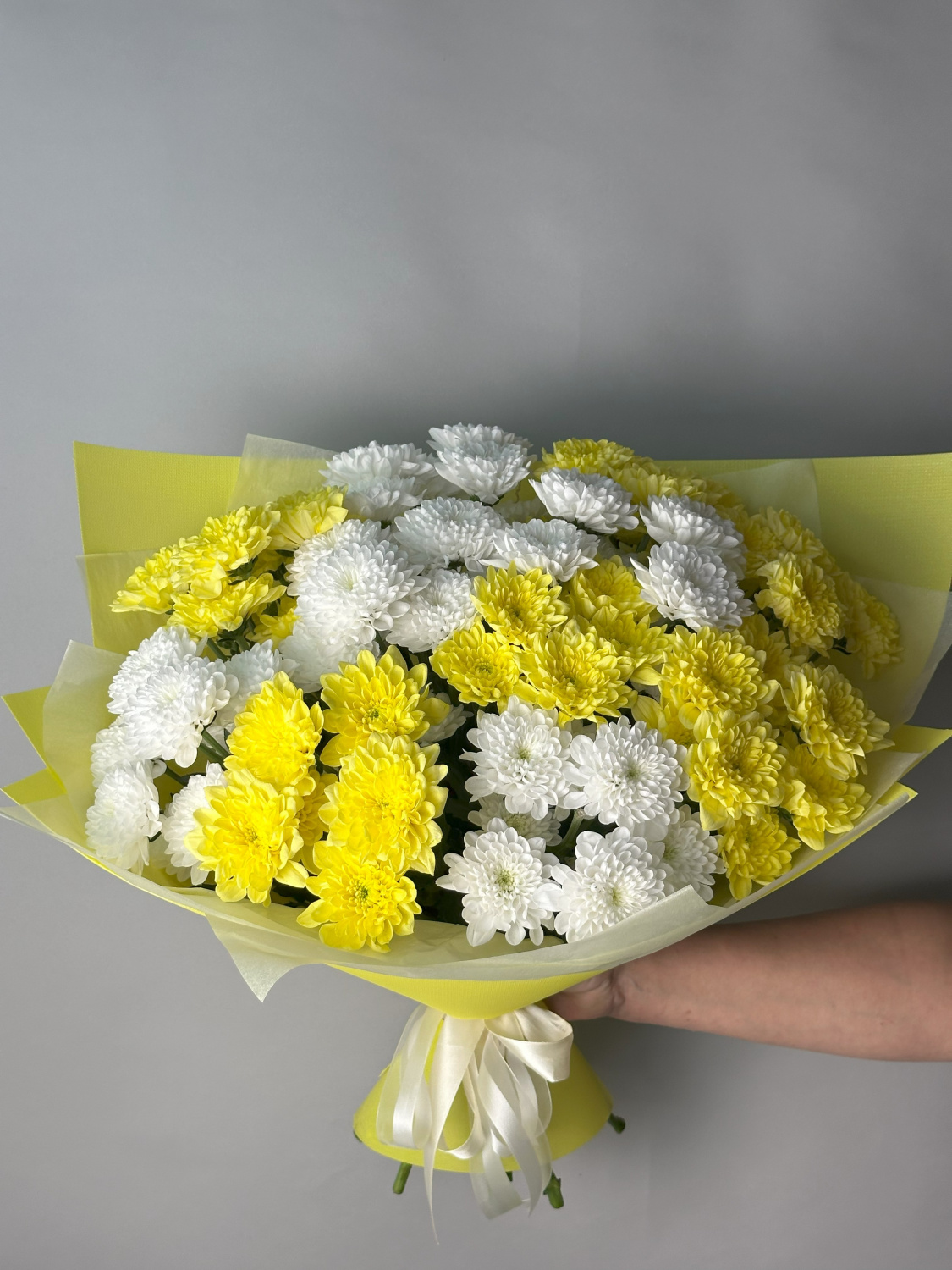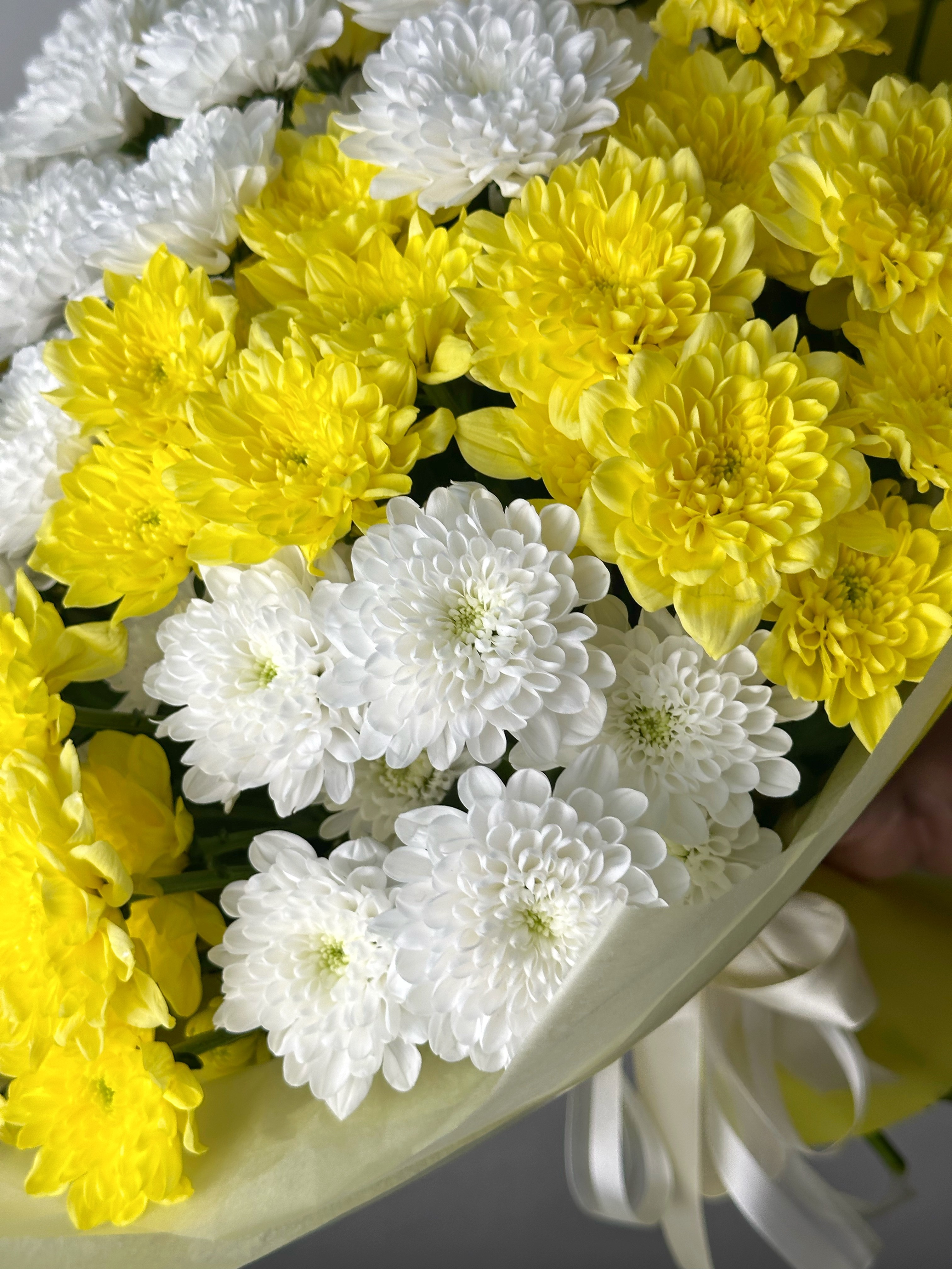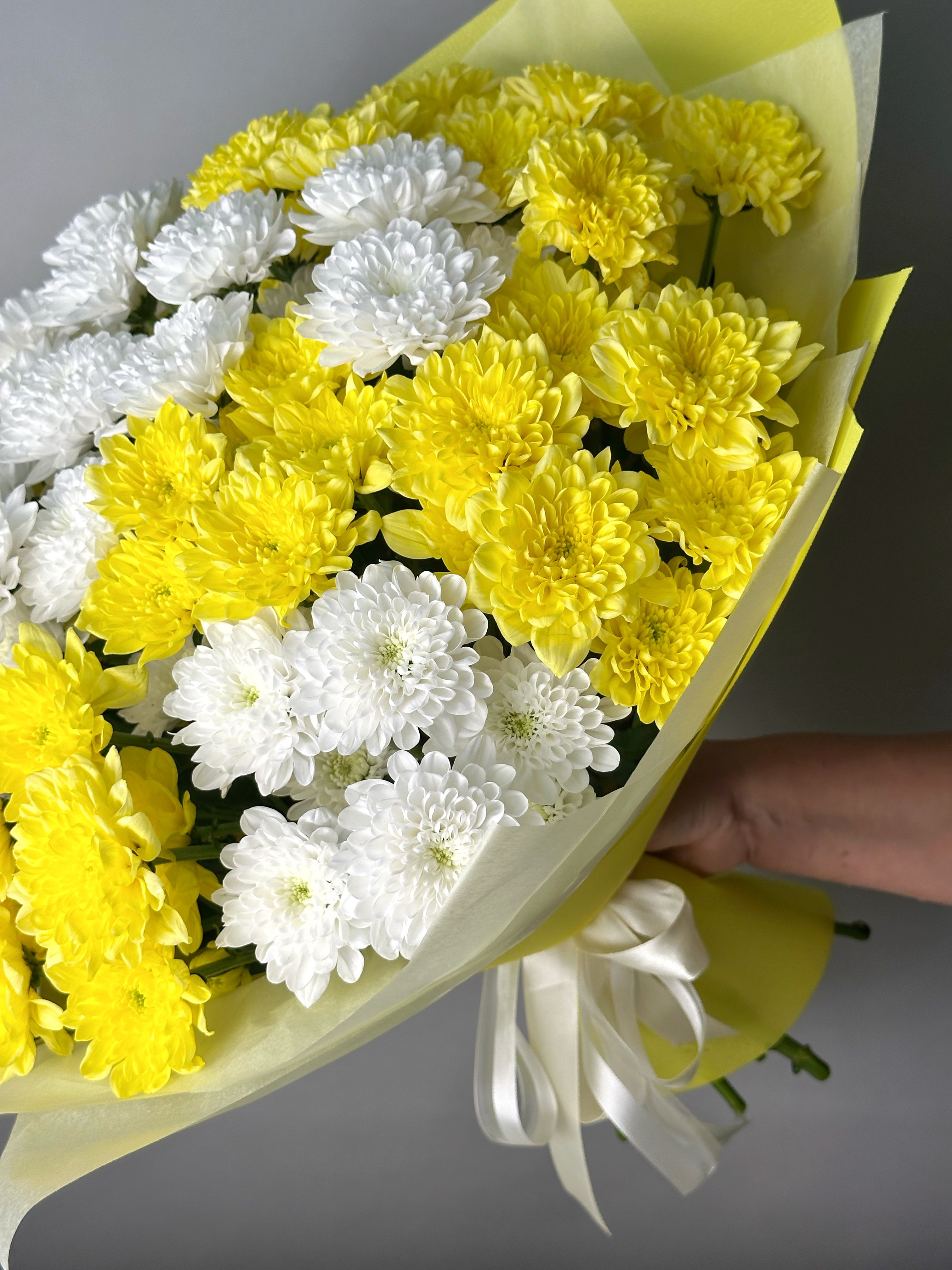 Пышный и солнечный букет из белых и желтых хризантем - настоящий привет теплого лета. Дарите цветы на праздник и просто так!