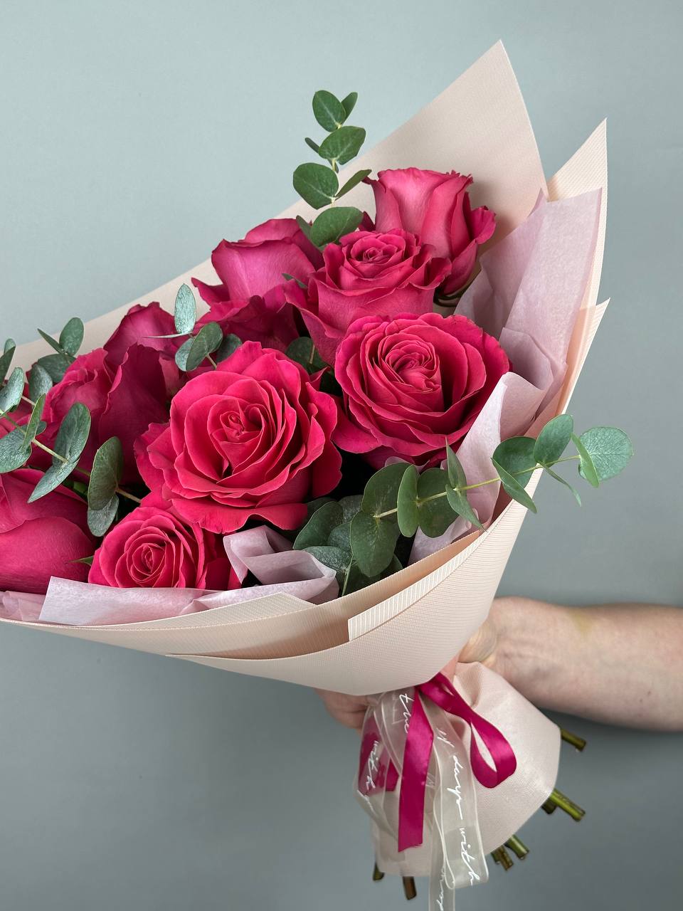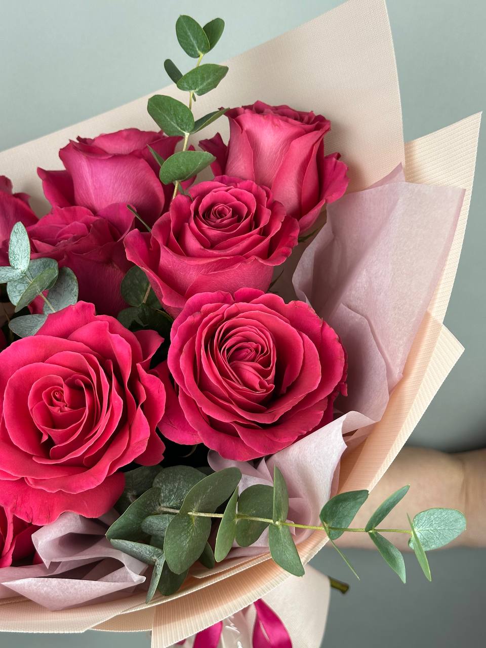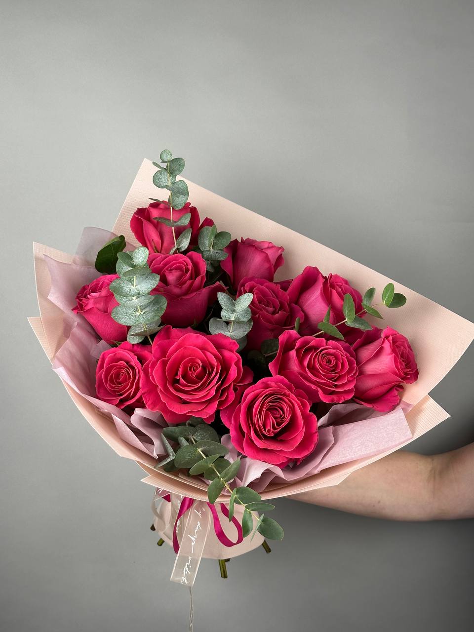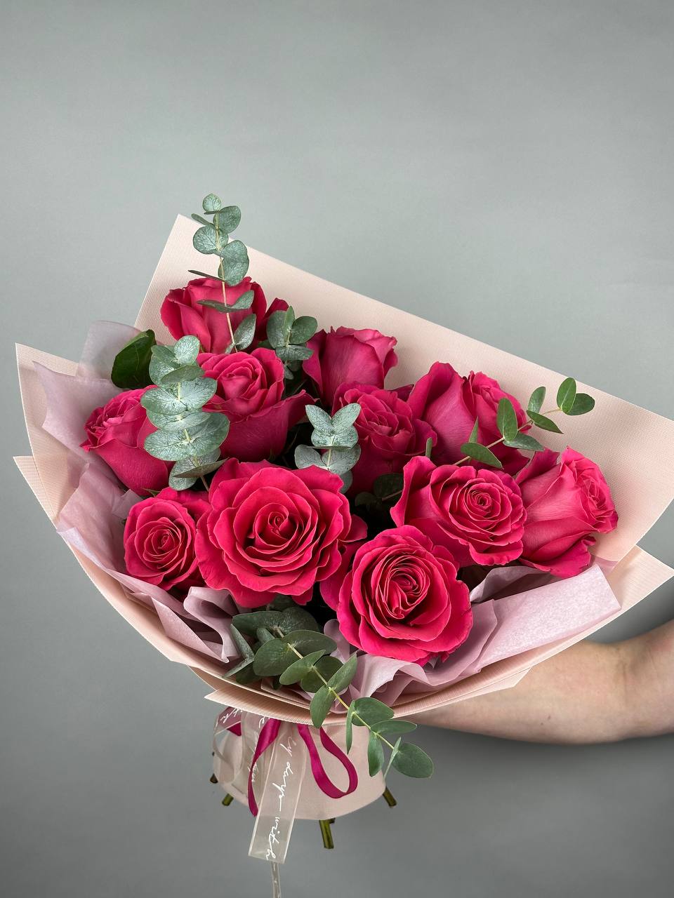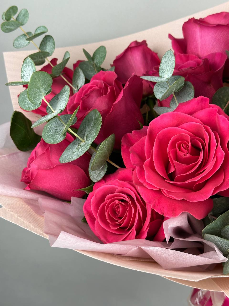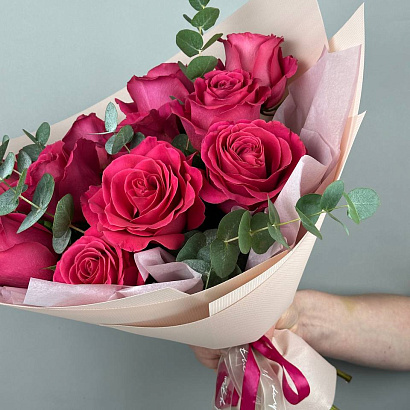 Великолепный розовый букет с веточками эвкалипта растопит любое сердце. Поздравляйте с праздниками и дарите радость просто так.