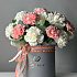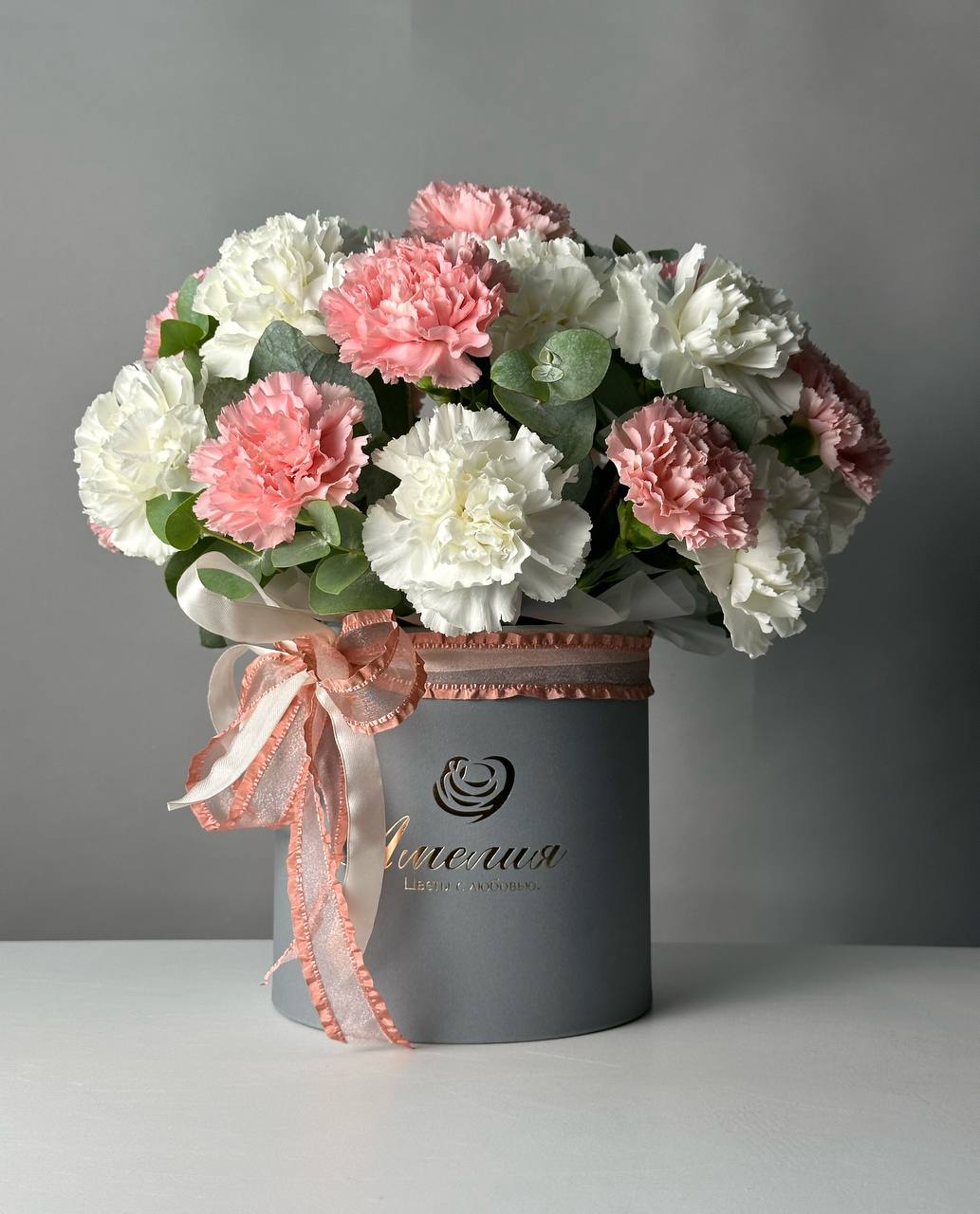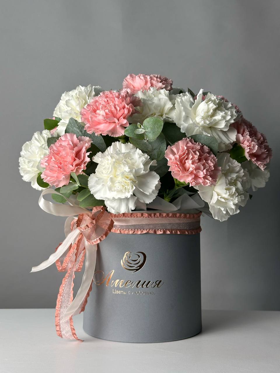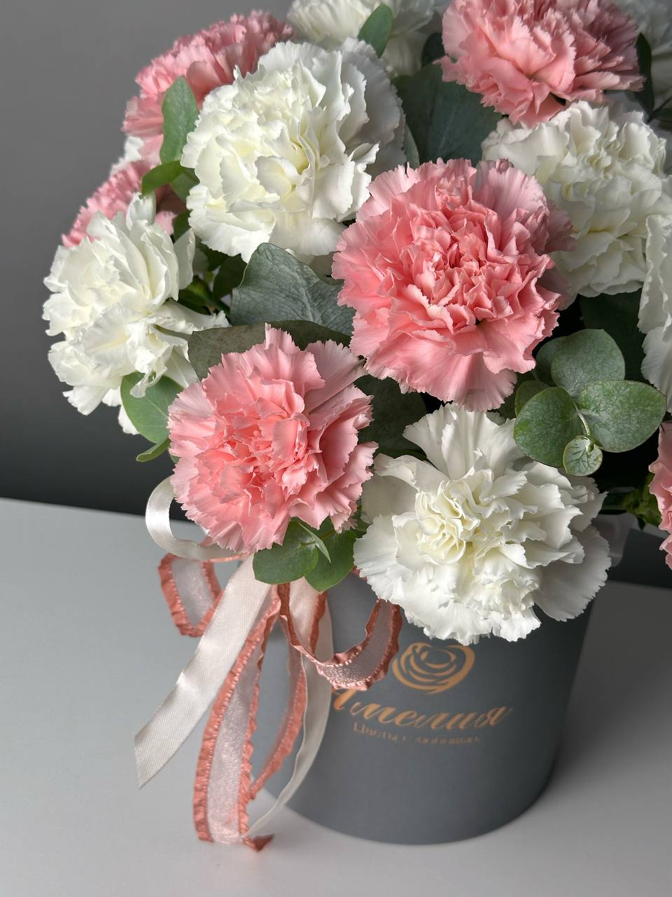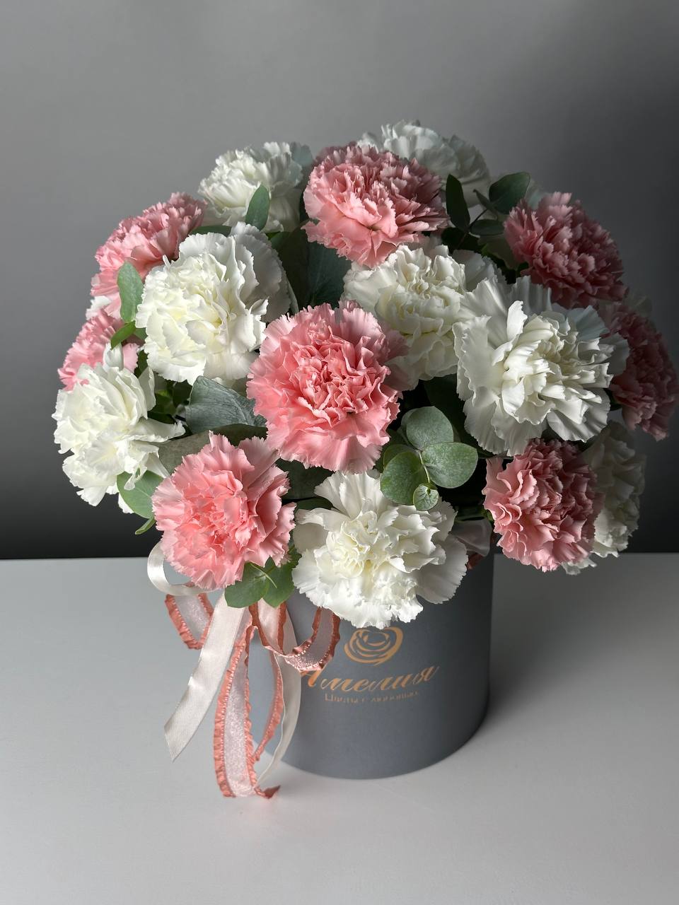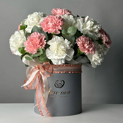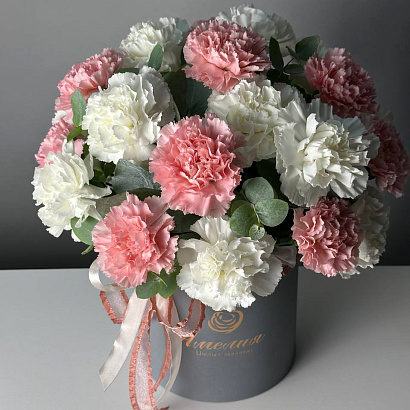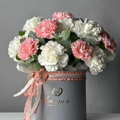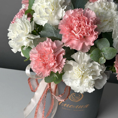 Цветочная композиция Облако чувств из белых и розовых гвоздик с добавлением эвкалиптовых веточек. Невероятно красивый букет в шляпной коробке.