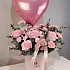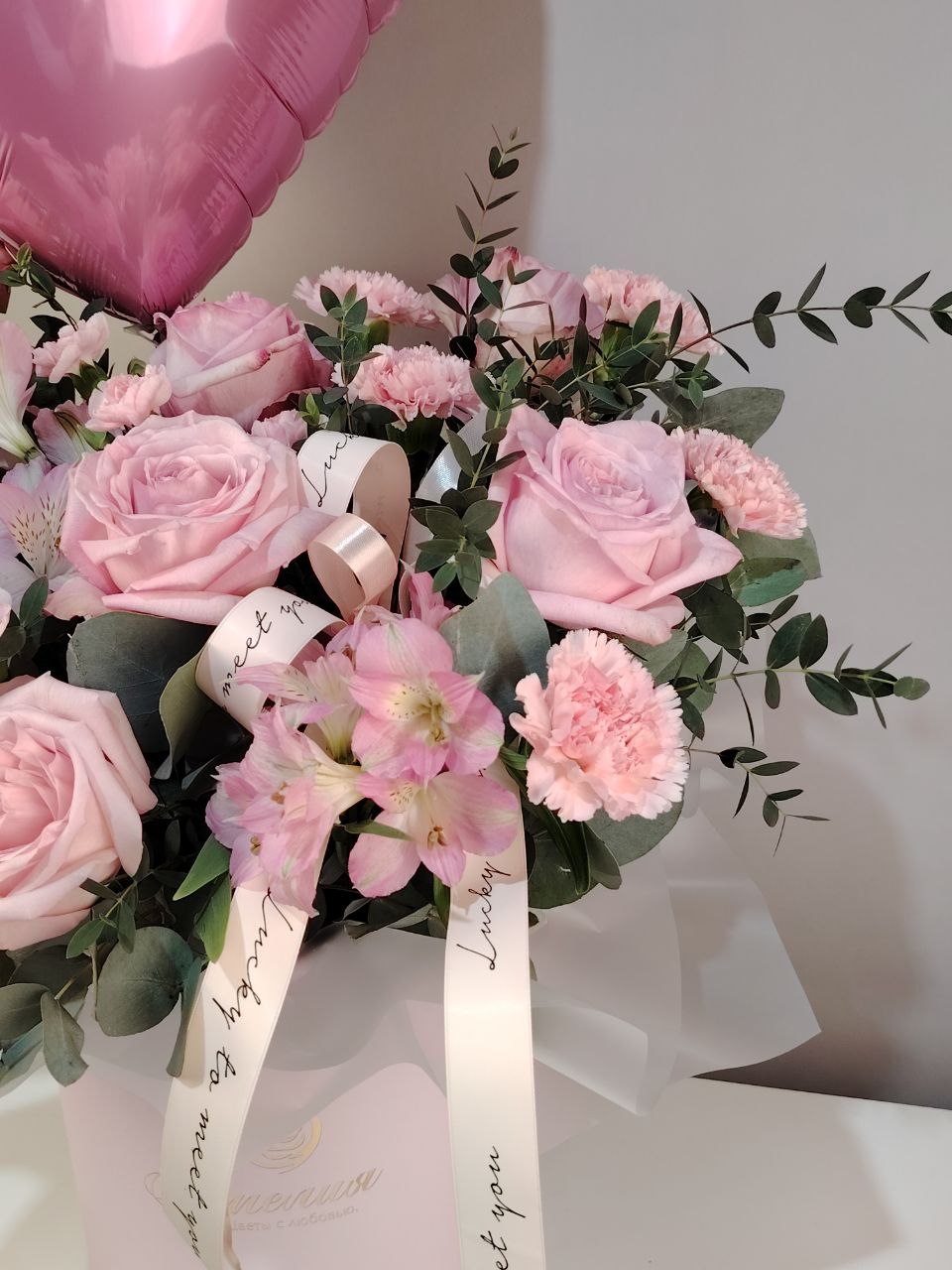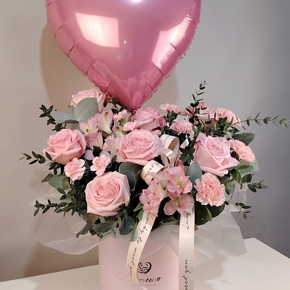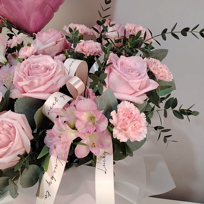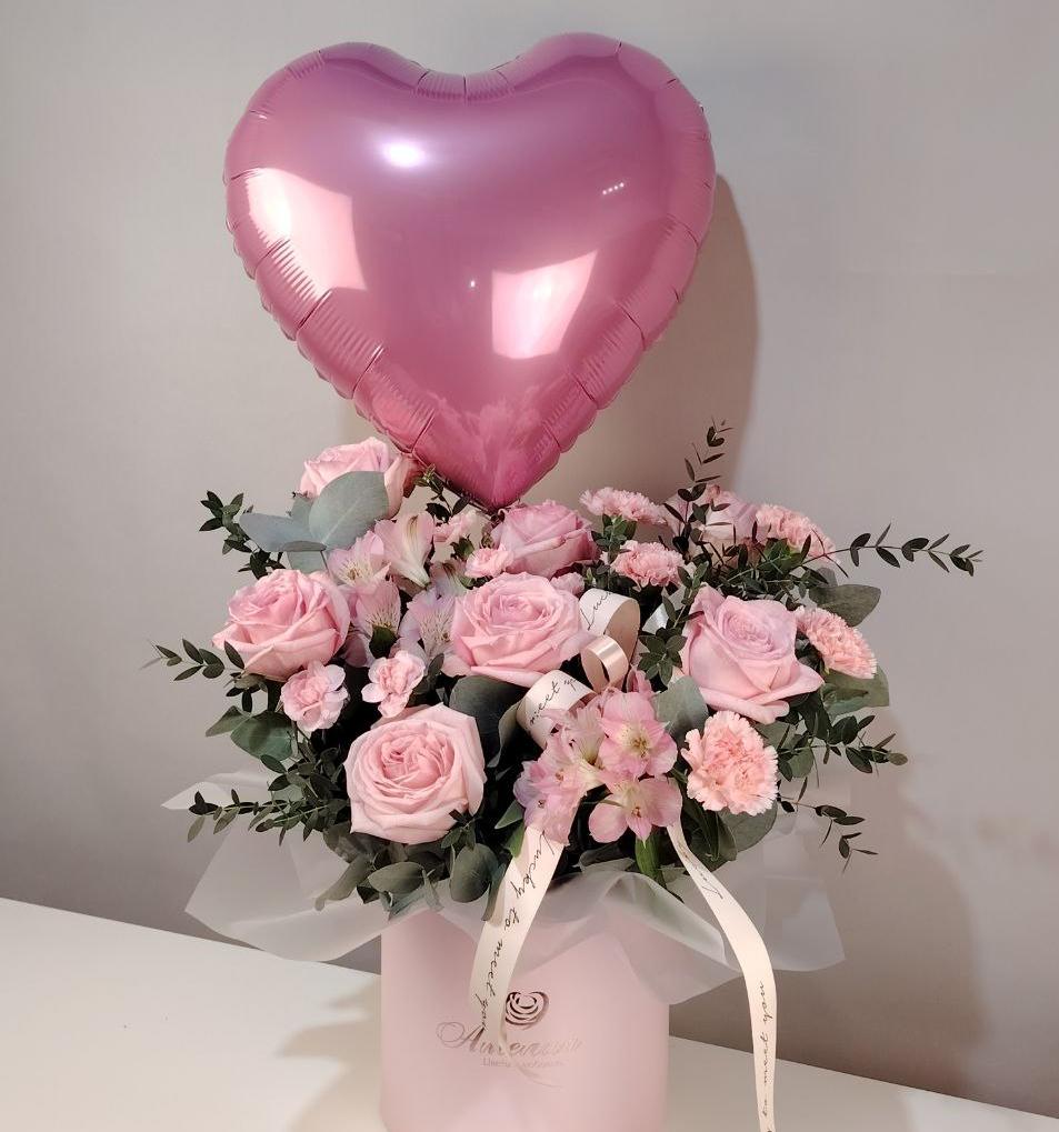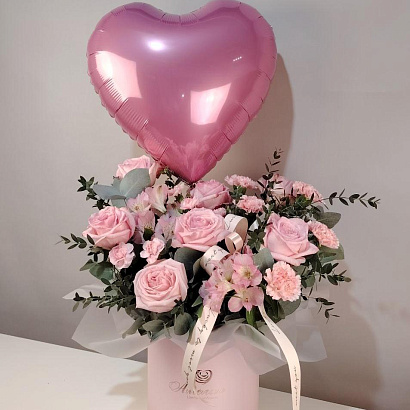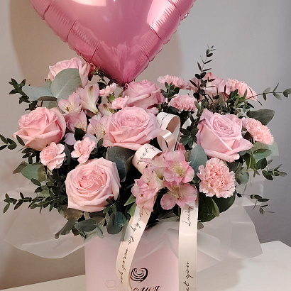 Романтичная цветочная композиция из розовых садовых роз и альстромерии с добавлением эвкалиптовых веточек. Композиция дополнена фольгированным шаром в форме сердца. Идеальный презент, чтобы рассказать о своих чувствах!