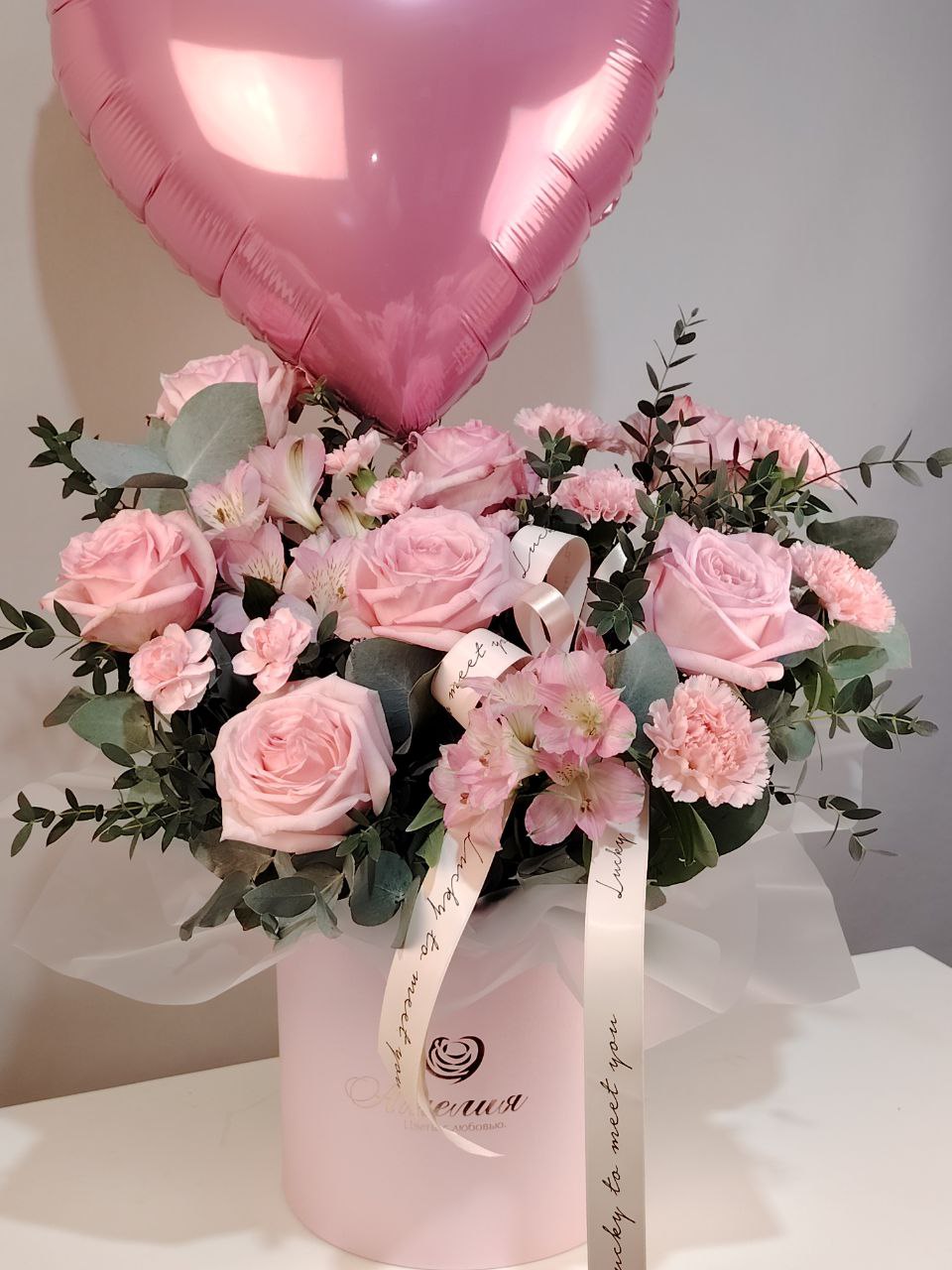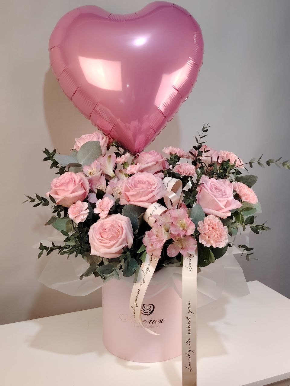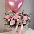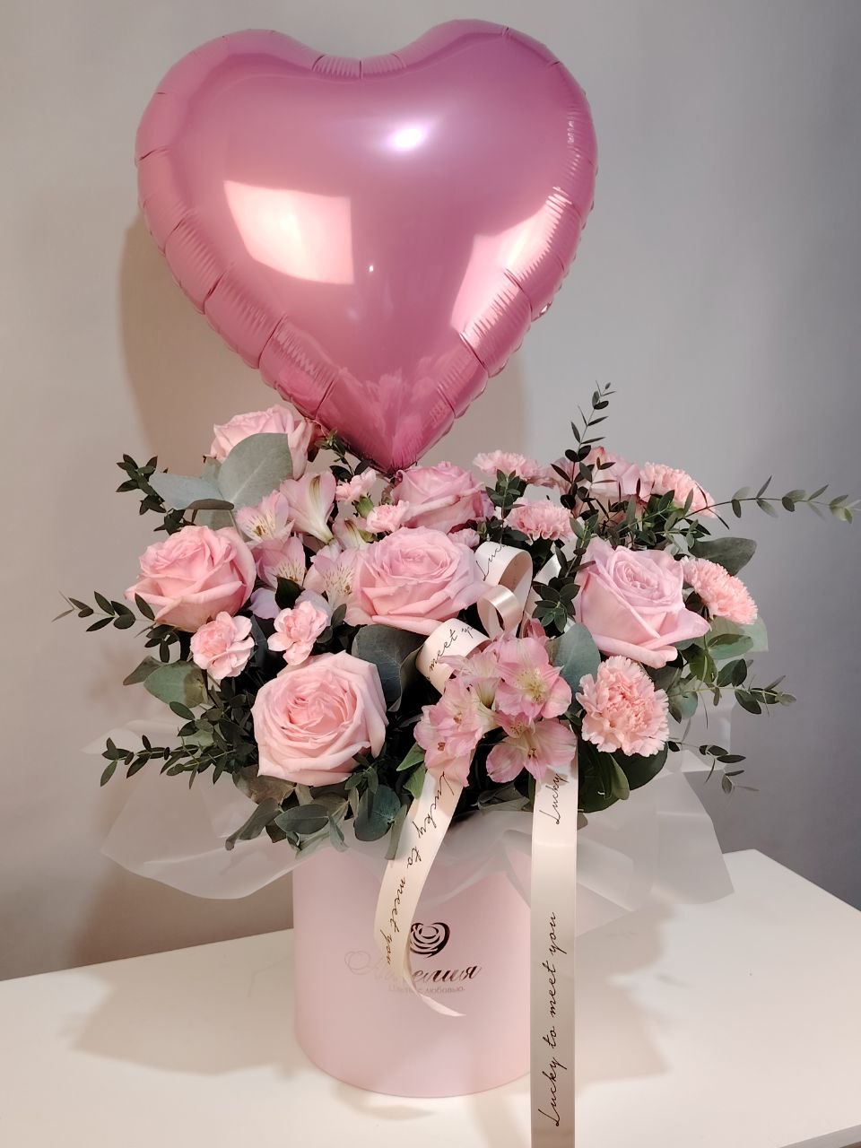 Романтичная цветочная композиция из розовых садовых роз и альстромерии с добавлением эвкалиптовых веточек. Композиция дополнена фольгированным шаром в форме сердца. Идеальный презент, чтобы рассказать о своих чувствах!