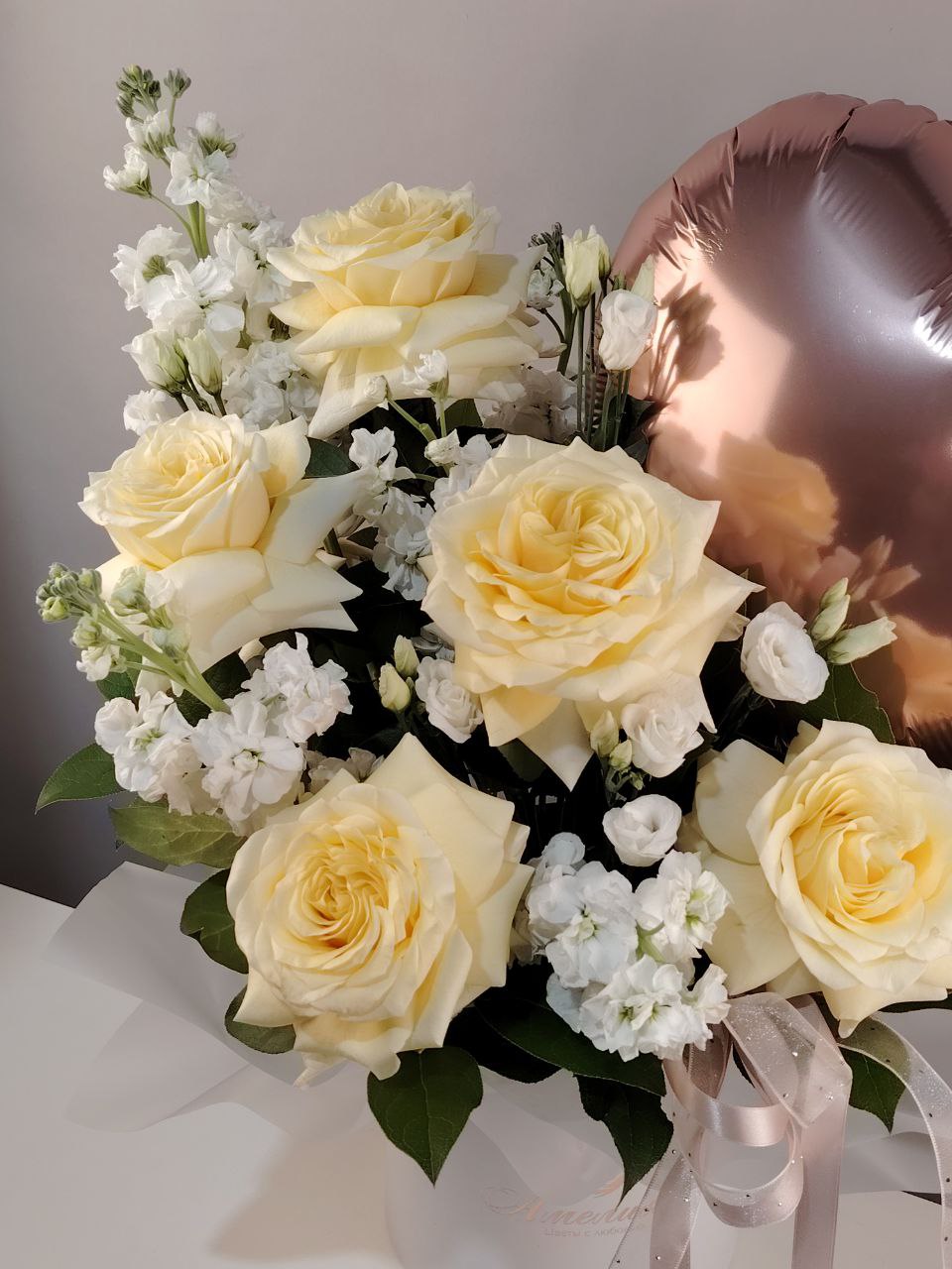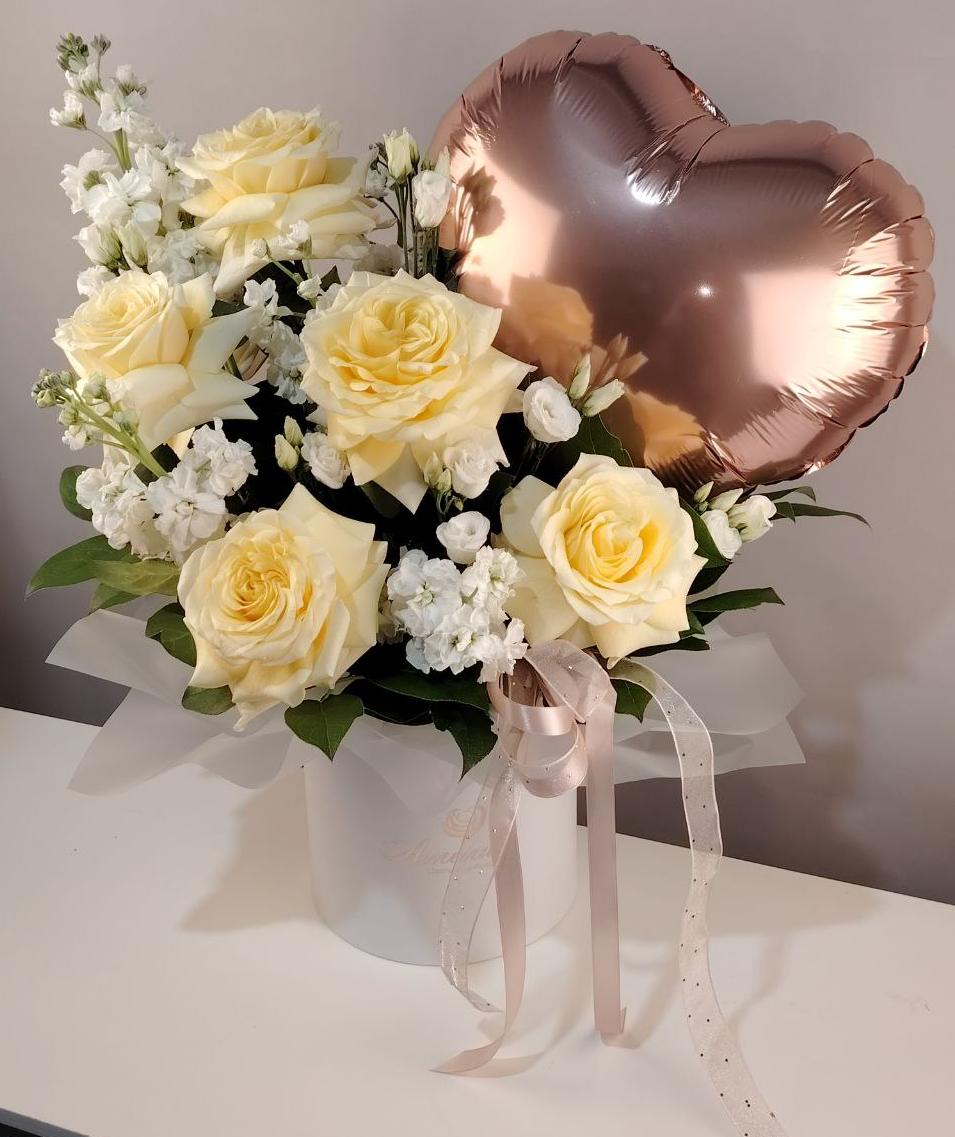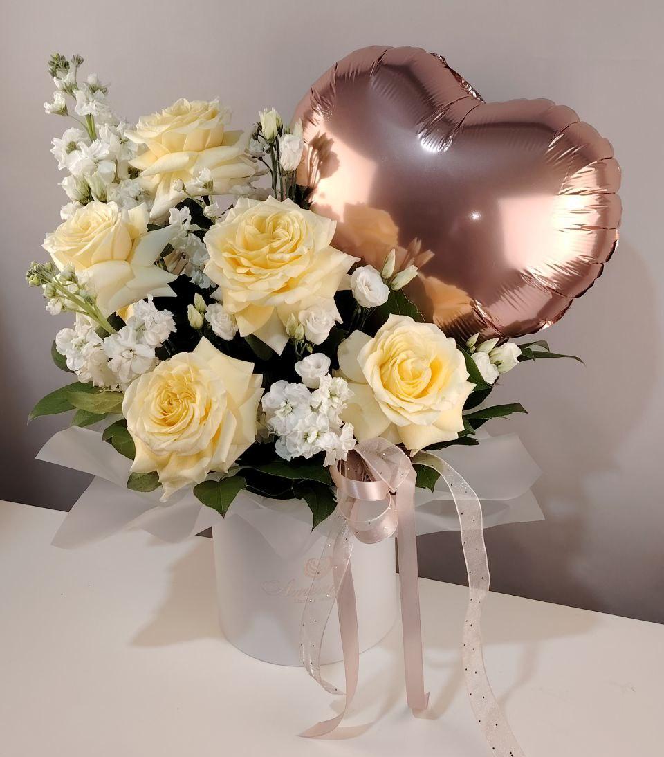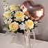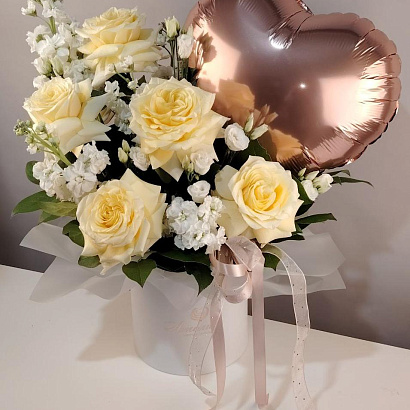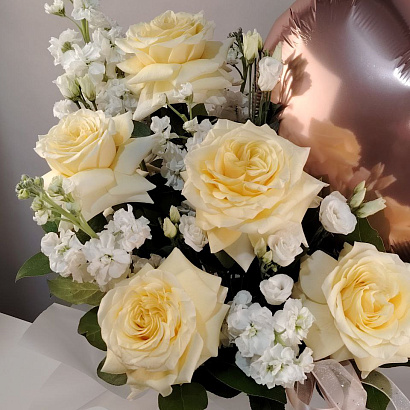 Нежная цветочная композиция из ванильных садовых роз, эустомы, маттиолы с добавлением веточек зелени. Композиция дополнена фольгированным шаром в форме сердца. Идеальный презент, чтобы рассказать о своих чувствах!