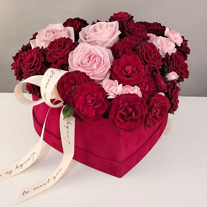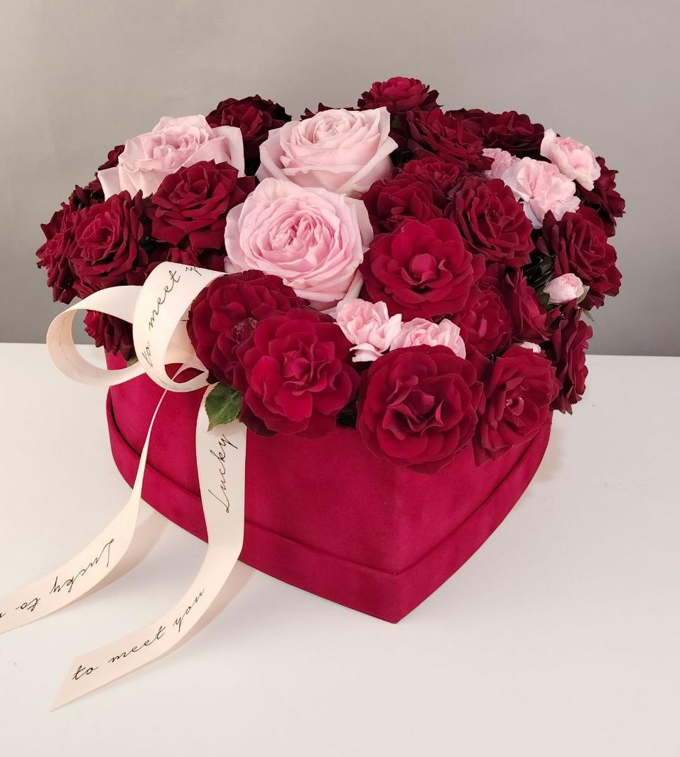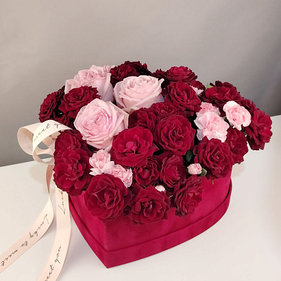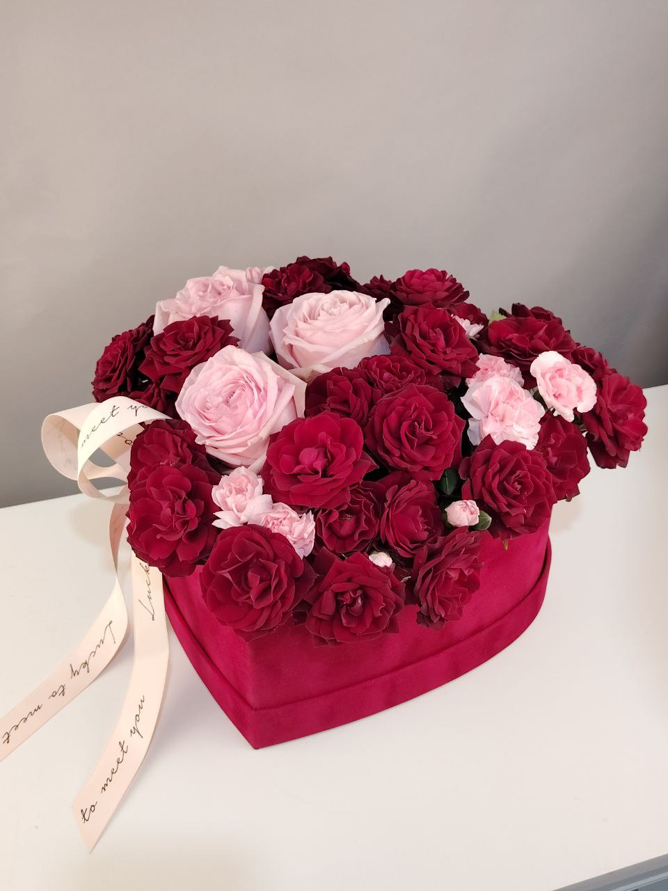 Яркая цветочная композиция из сортовых гвоздик и роз в большой бархатной коробке в форме сердца. Рассказать о самых трепетных чувствах -