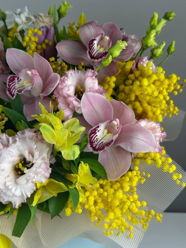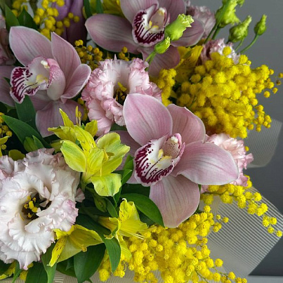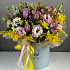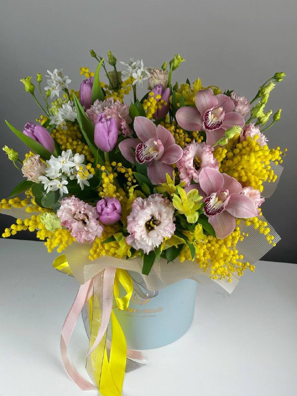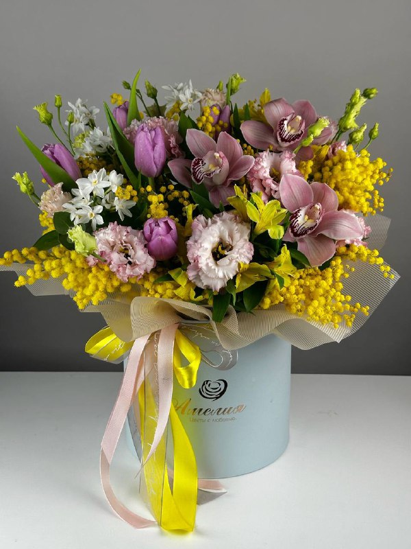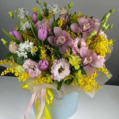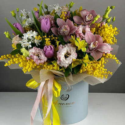 Букет в шляпной коробке Улыбнись весне из первых весенних цветов, солнечной мимозы и нежной орхидеи. Порадуйте своих любимых красивым цветочным презентом от Амелии.