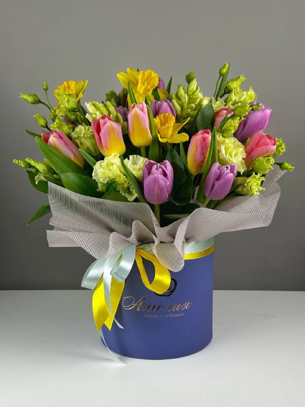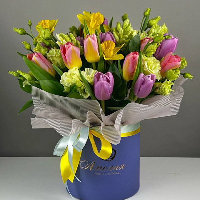 Букет в шляпной коробке Очарование весны из первых весенних цветов.