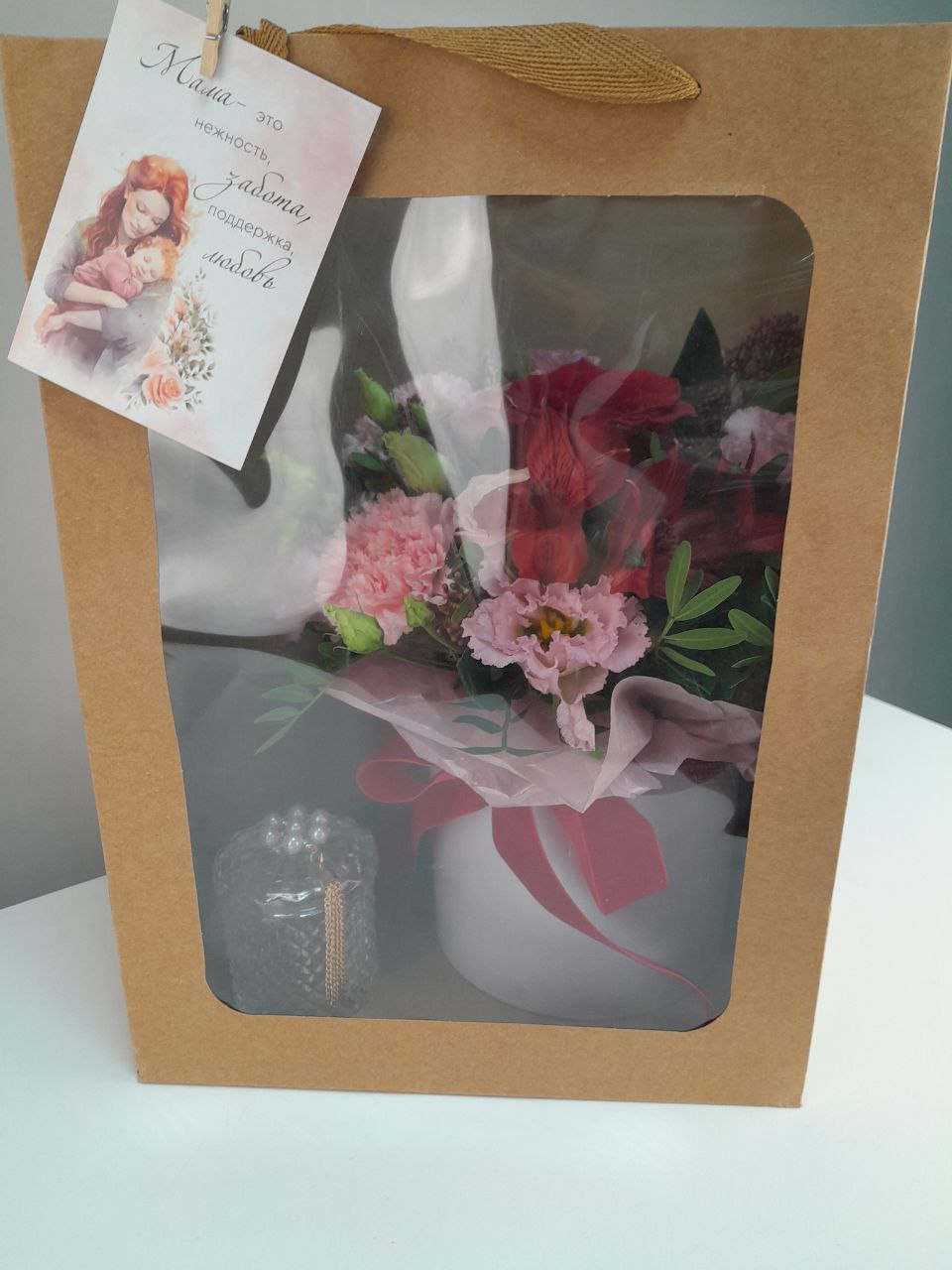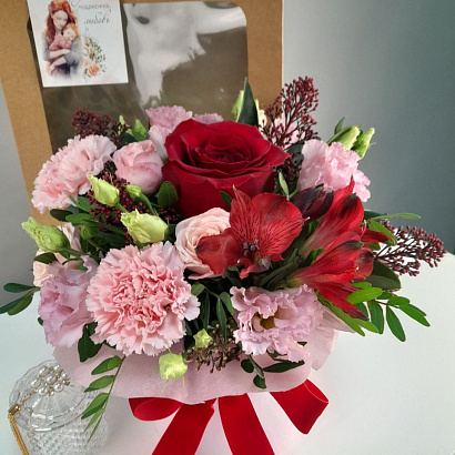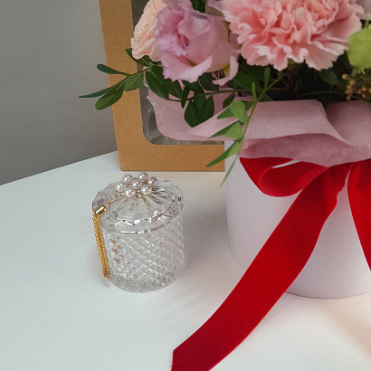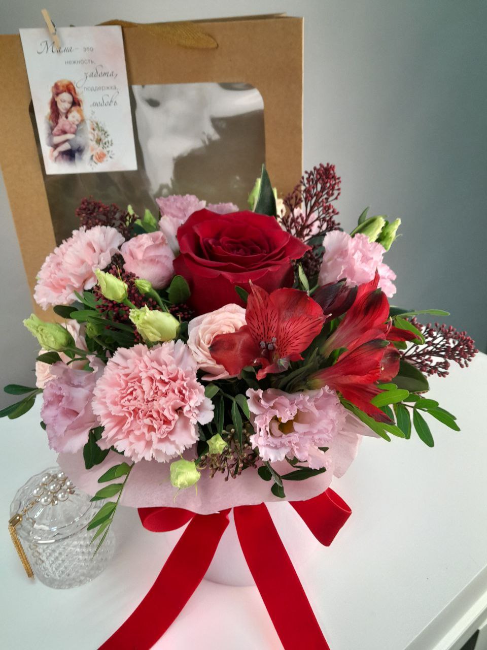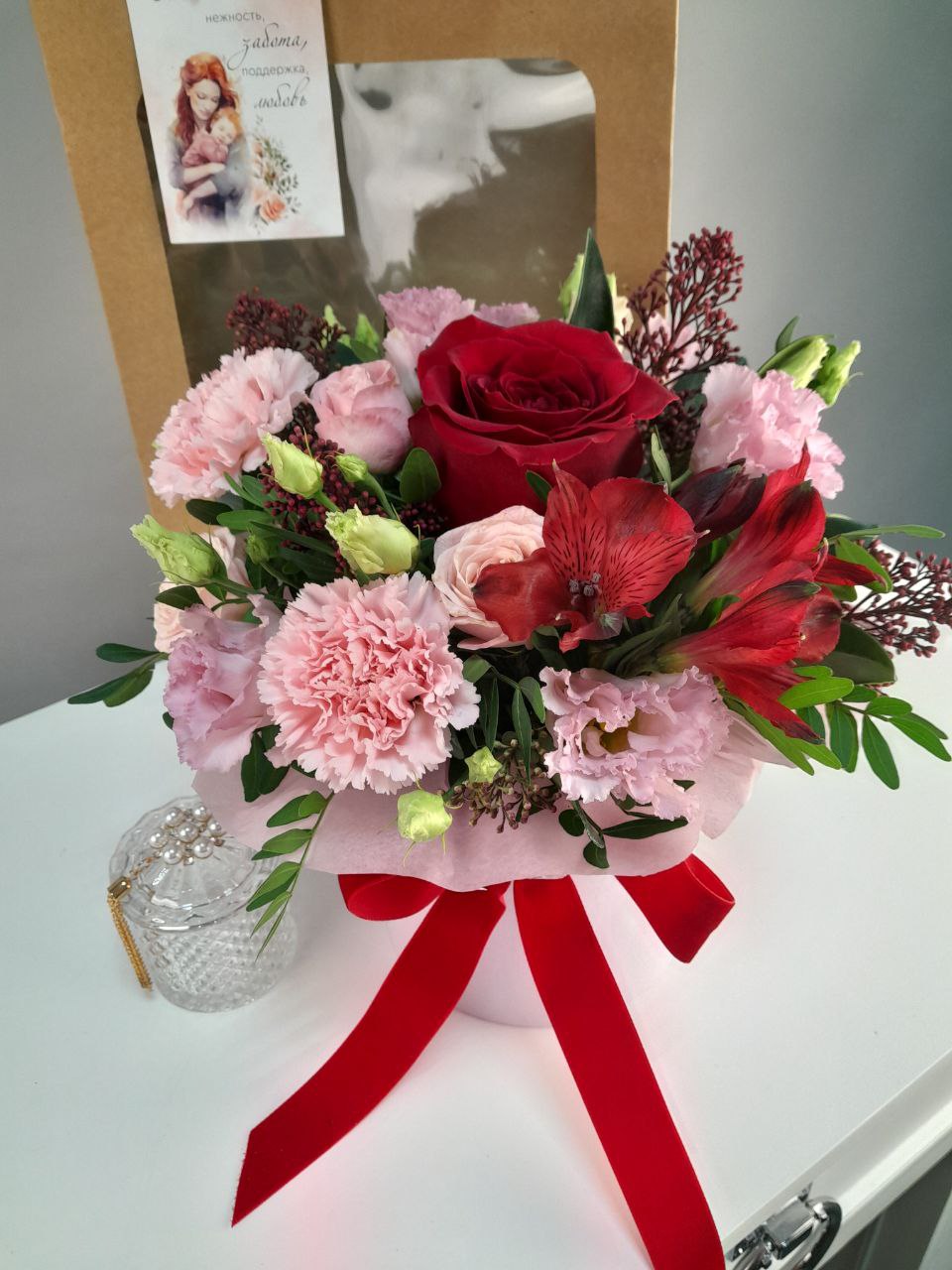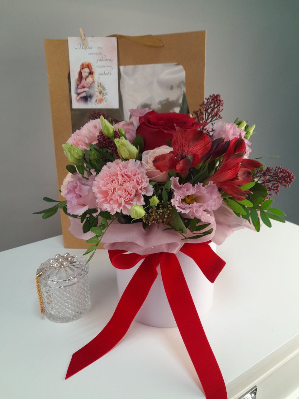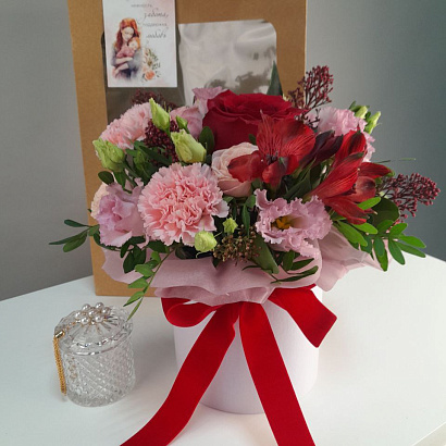 Трогательный подарочный набор для мамы! Нежный букет в шляпной коробке и элегантная шкатулка для любимых украшений упакованы в подарочный пакет с открыткой. Мамам так важно знать, что их любят и ценят.