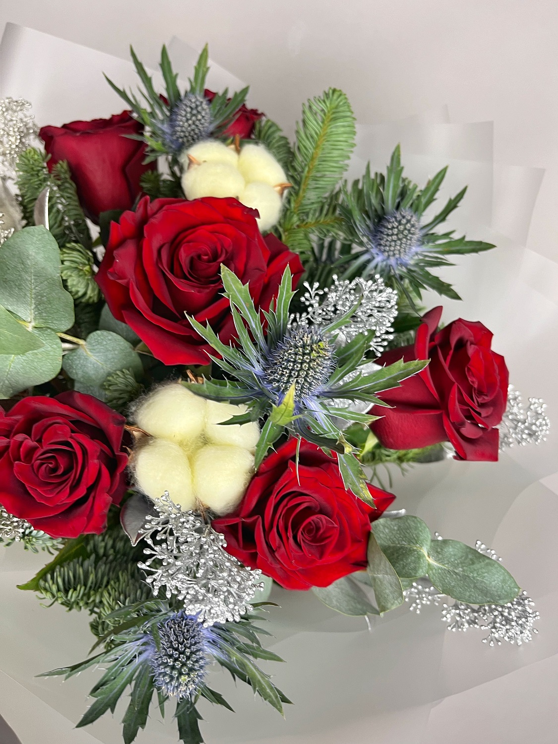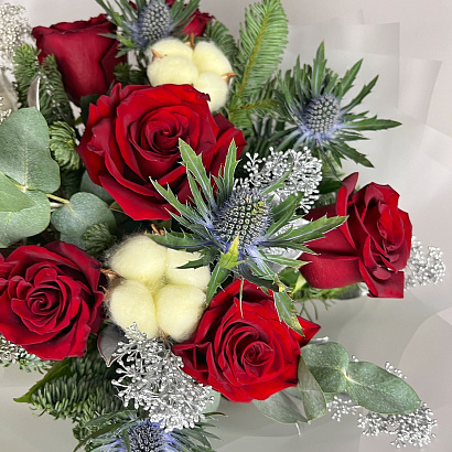 Наши букеты растрогают самое неприступное сердце! Ароматные веточки нобилиса в роковом соседстве с алыми розами. Дарите эмоции, а мы бесплатная доставим в Великом Новгороде!