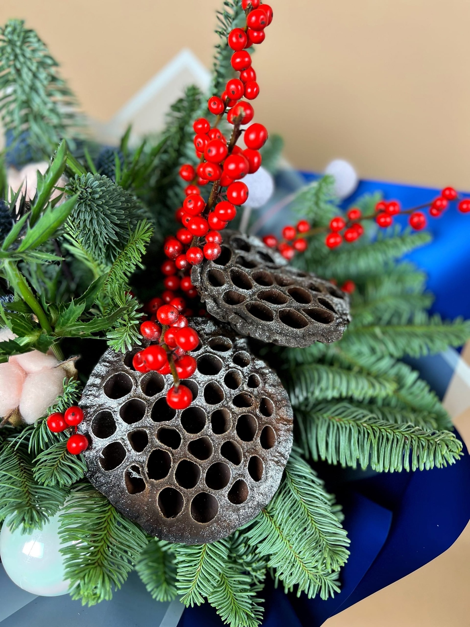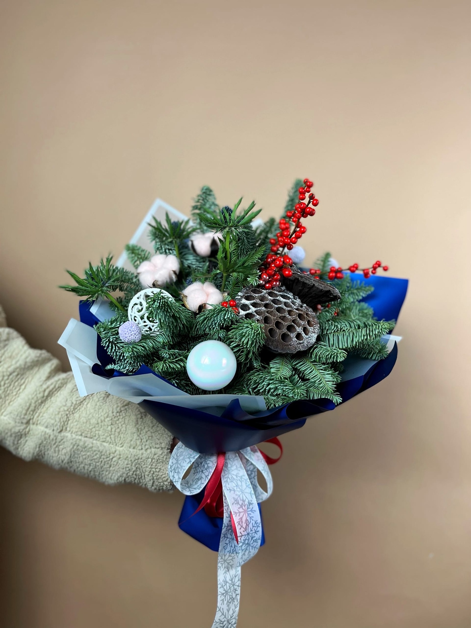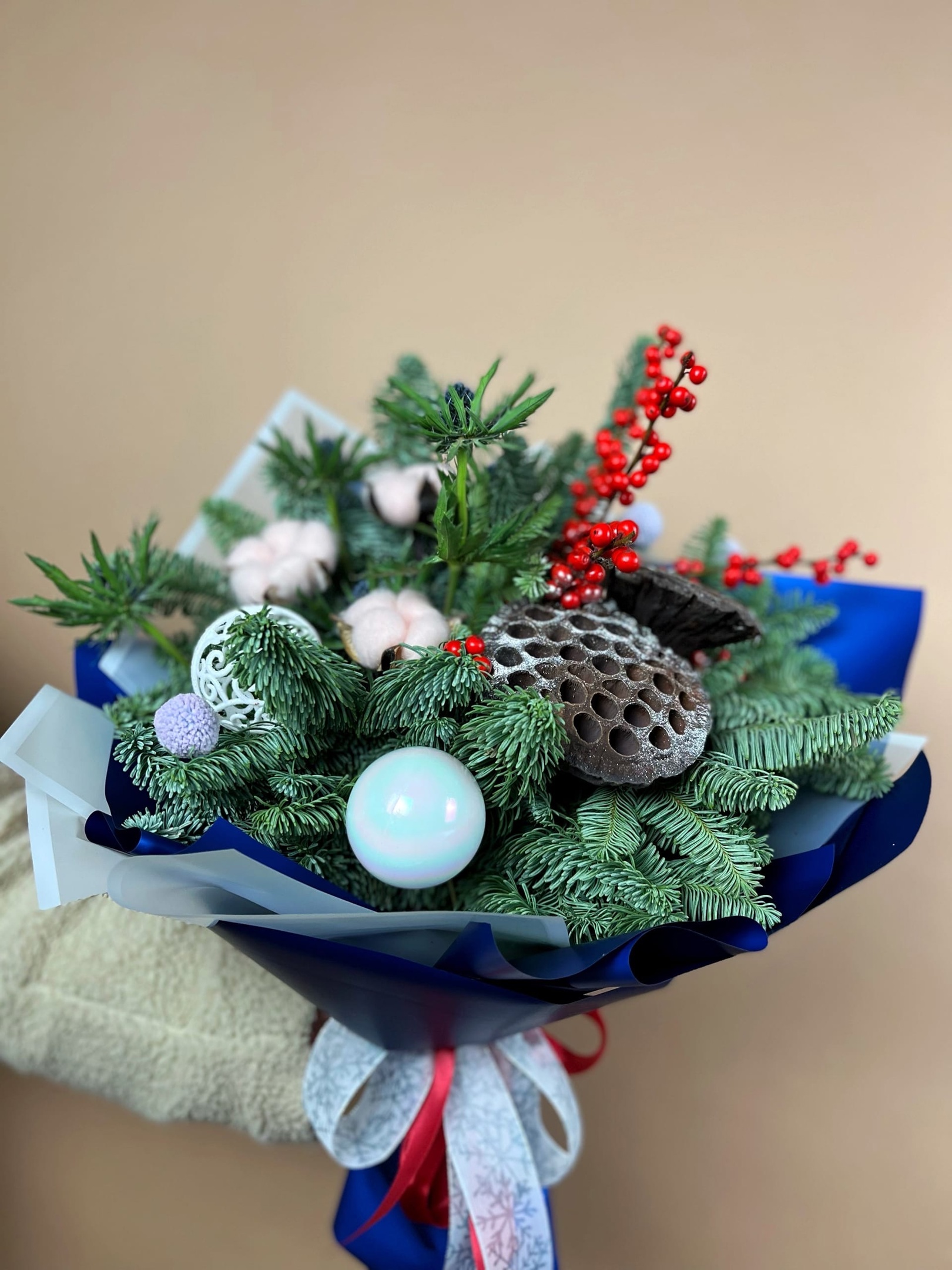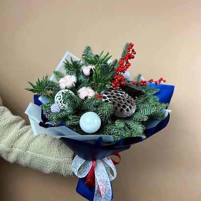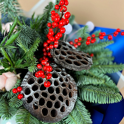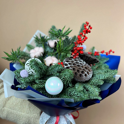 Букет Морозное утро это букет из веточек нобилиса, илекса, коробочек хлопка и лотоса, дополненные новогодним декором.