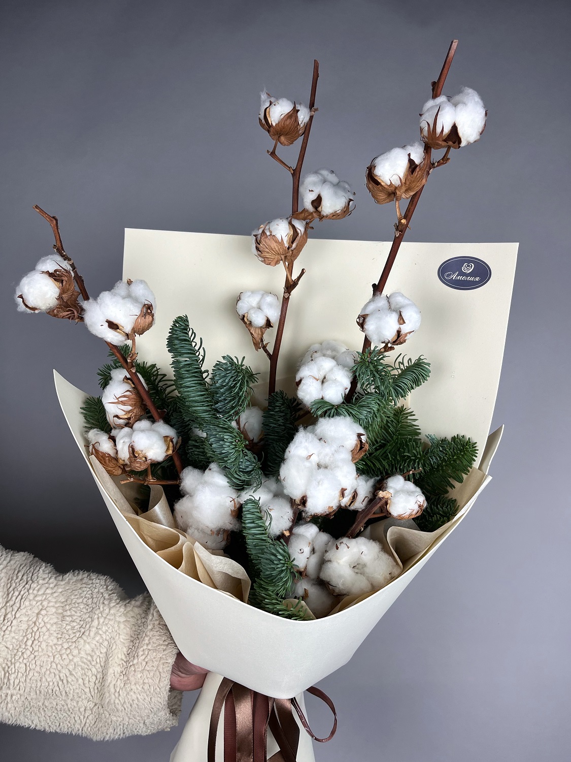 Букет, который долго не завянет и создаст зимнее настроение. Оригинальный презент из веточек нобилиса и нежного хлопка.