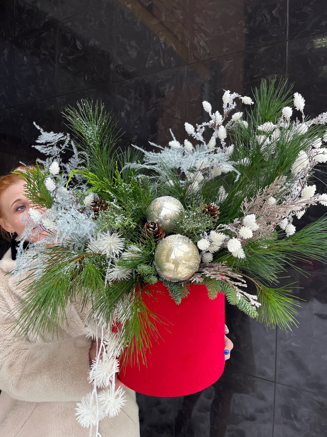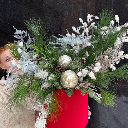 Подарите новогоднее настроение! Стильный букет в шляпной коробке из заснеженных веток датской пихты и белоснежного декора словно морозные узоры наполнит дом ароматом зимы и праздника!
