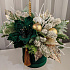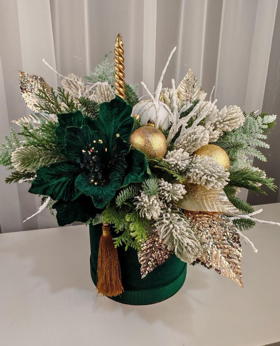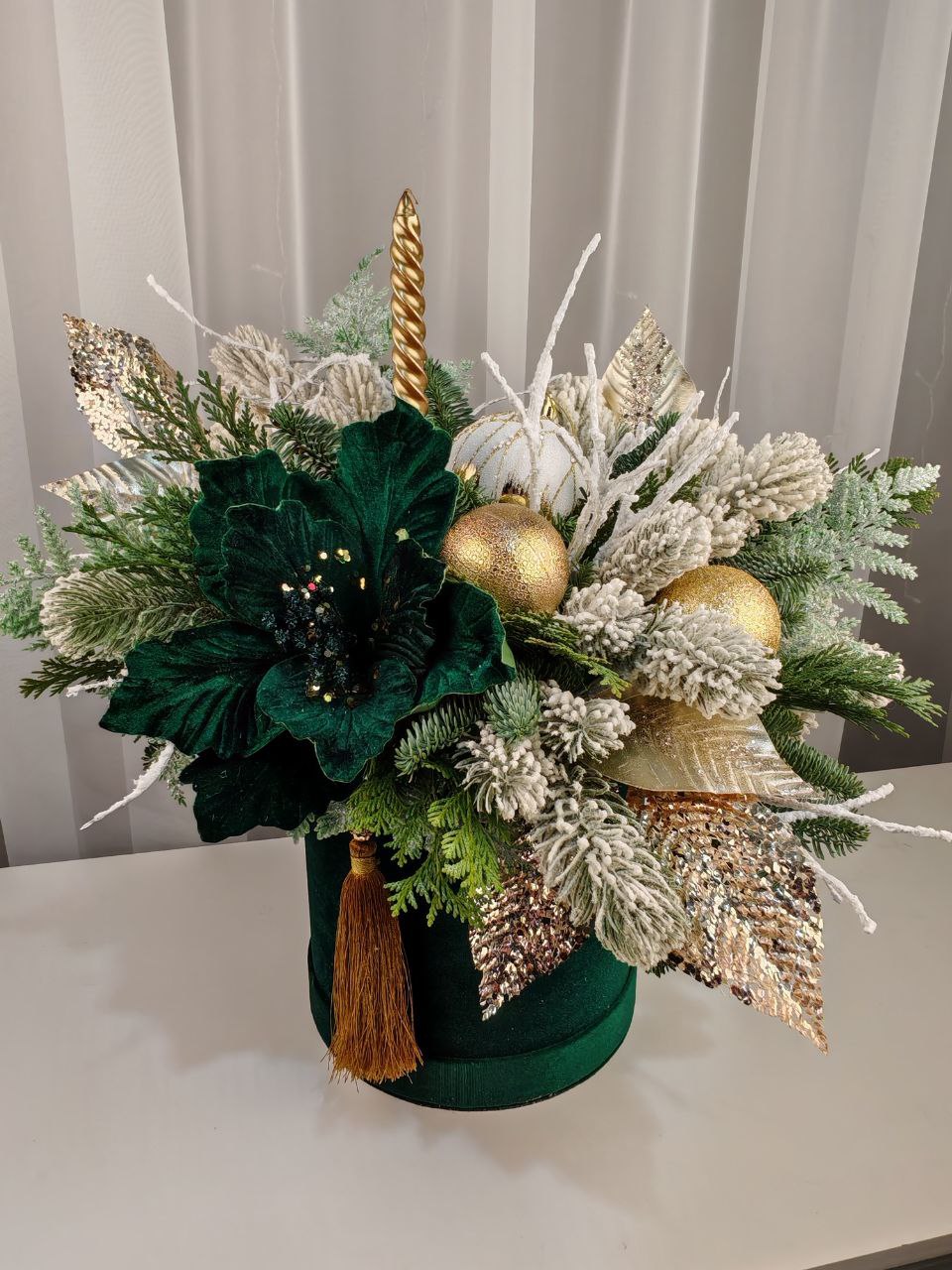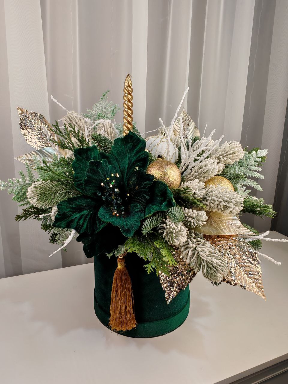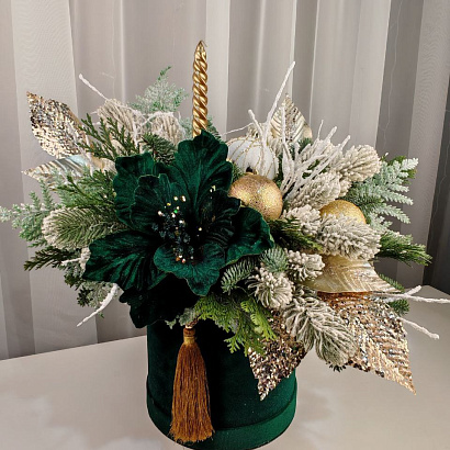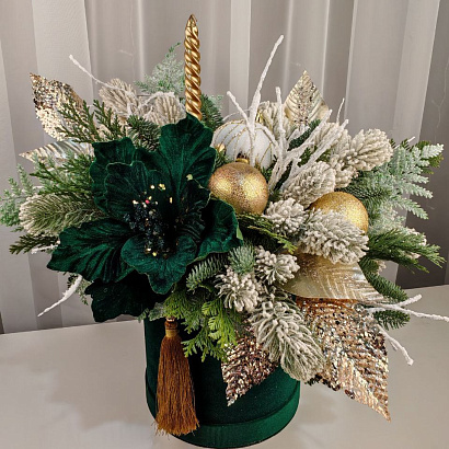 Стильная и элегантная зимняя композиция в изумрудной бархатной коробке с заснеженными ароматными веточками нобилиса, сосны и можжевельника. Украшена блестящими шарами и золотой свечой. Этот презент незамедлительно вызовет праздничное настроение и украсит интерьер дома или офиса.