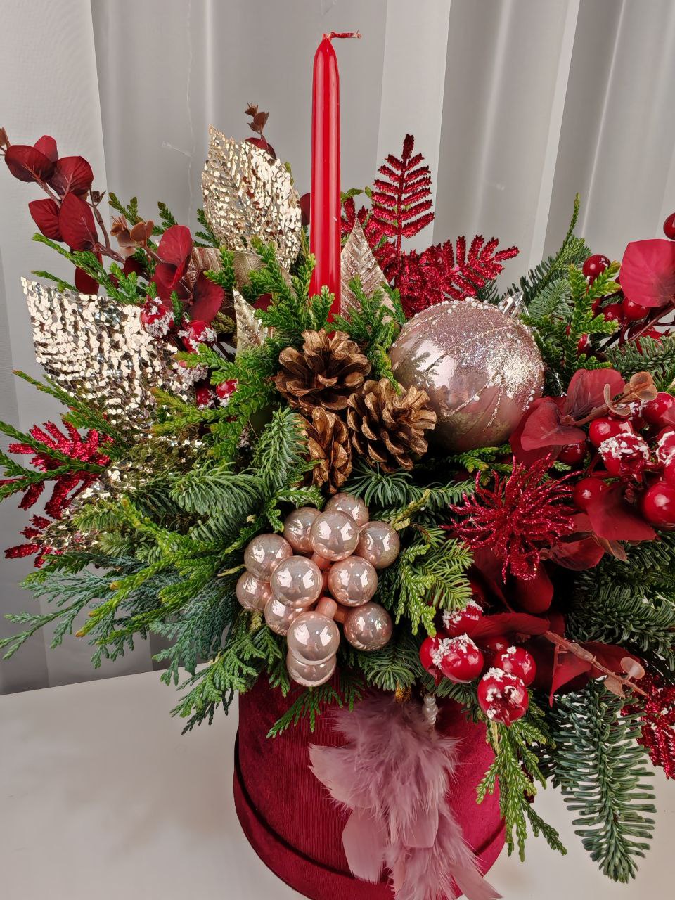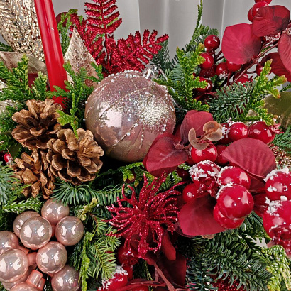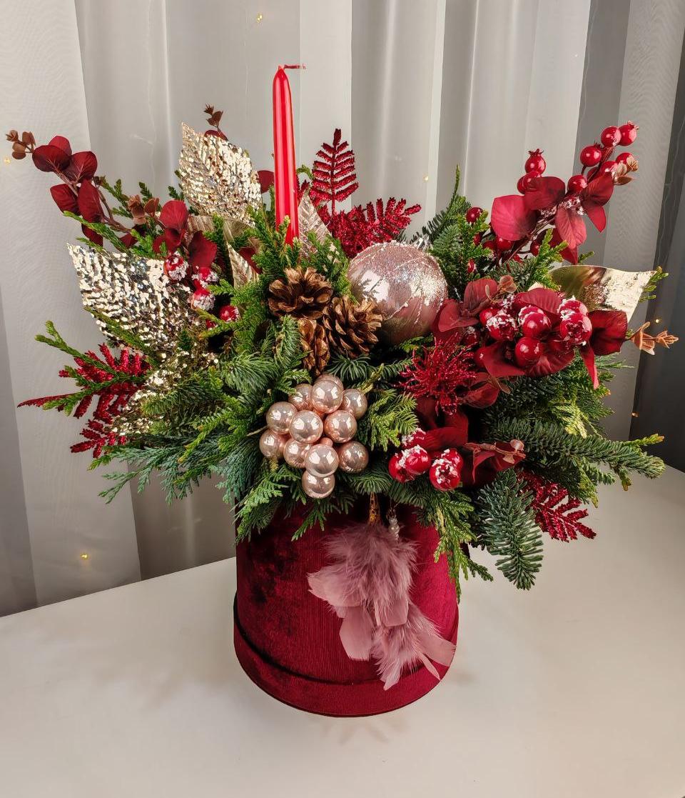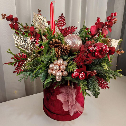 Элегантная и яркая зимняя композиция в рубиновой бархатной коробке с ароматными веточками нобилиса, сосны и можжевельника. Украшена блестящими шарами и свечой. Этот презент незамедлительно подарит праздничное настроение и позитивные эмоции.