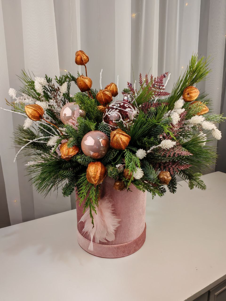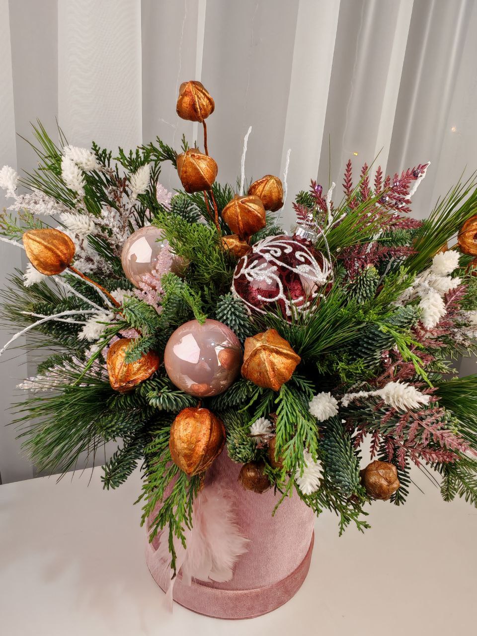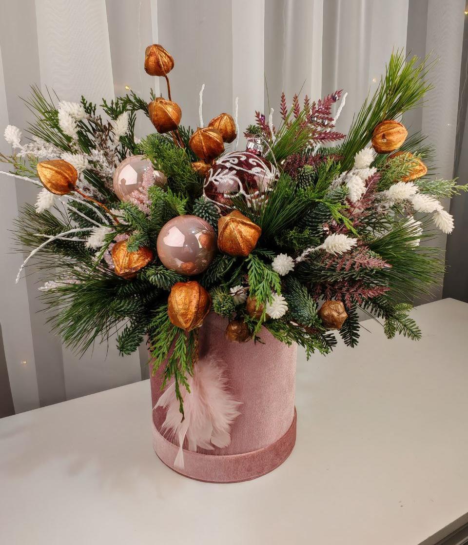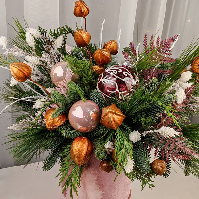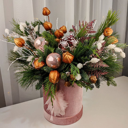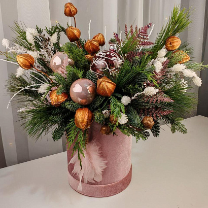 Нежная изысканная зимняя композиция (малый размер) в розовой бархатной коробке с заснеженными ароматными веточками нобилиса, сосны и можжевельника. Празднично декорирована шарами. Такой презент привнесет в интерьер дома или офиса новогоднее настроение.