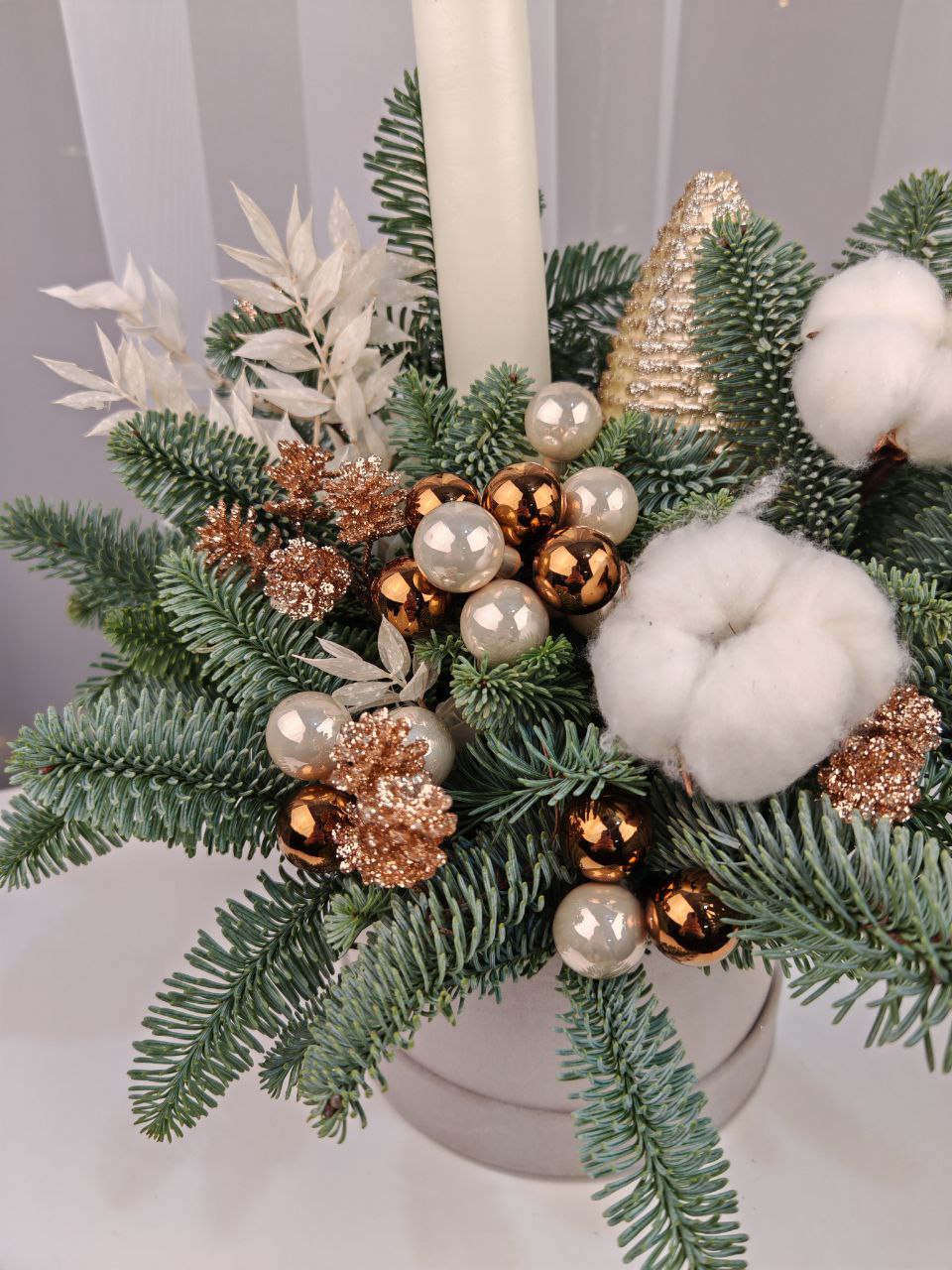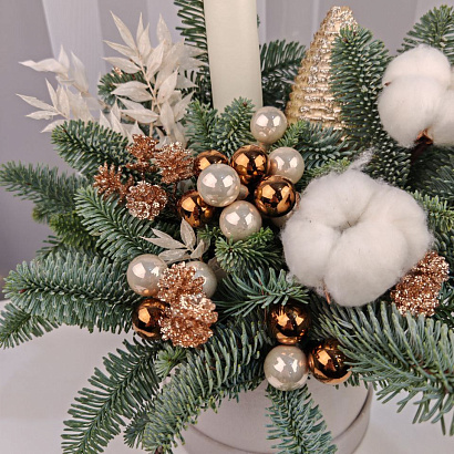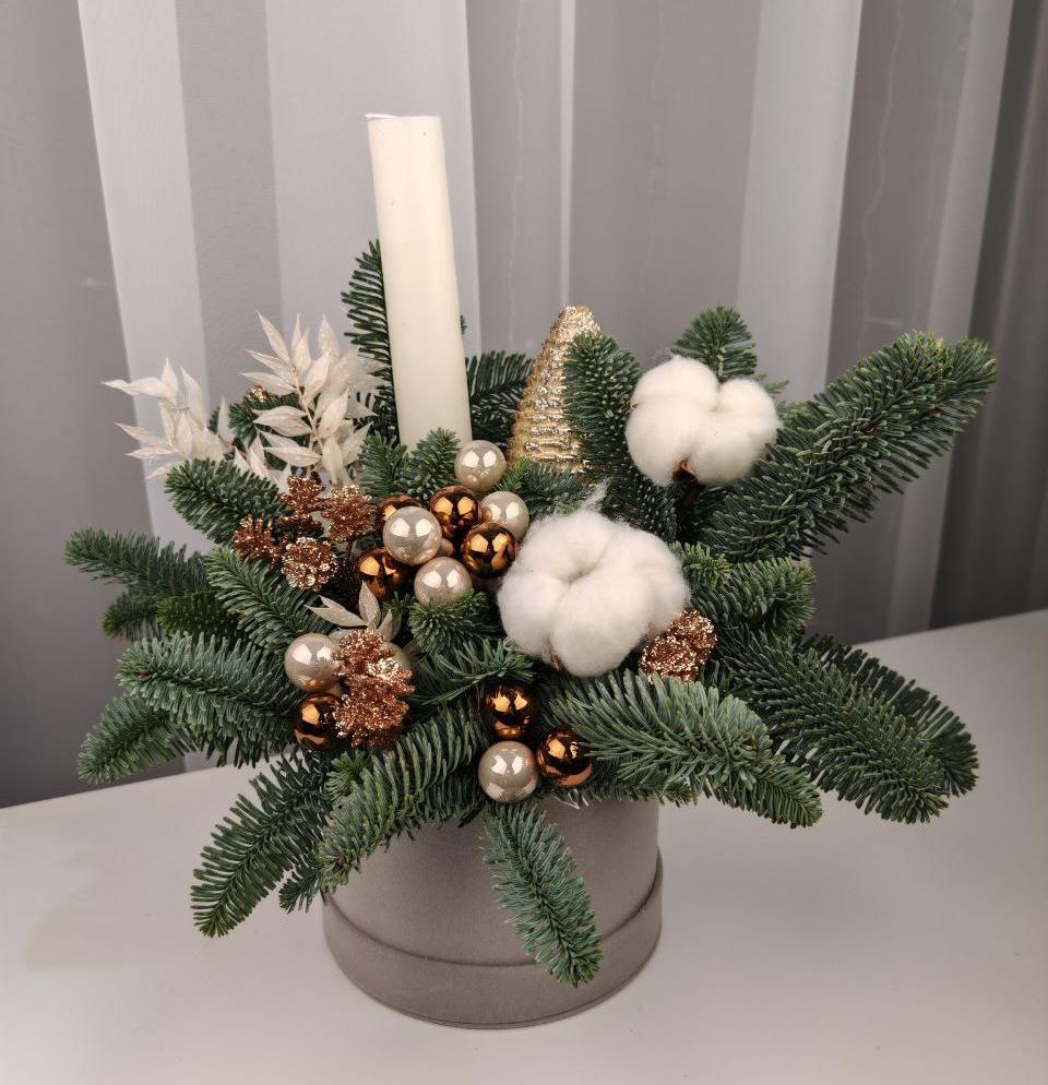 Нежная зимняя композиция в шляпной коробке коробке с ароматными веточками нобилиса, свечой, коробочками хлопка и праздничным декором.