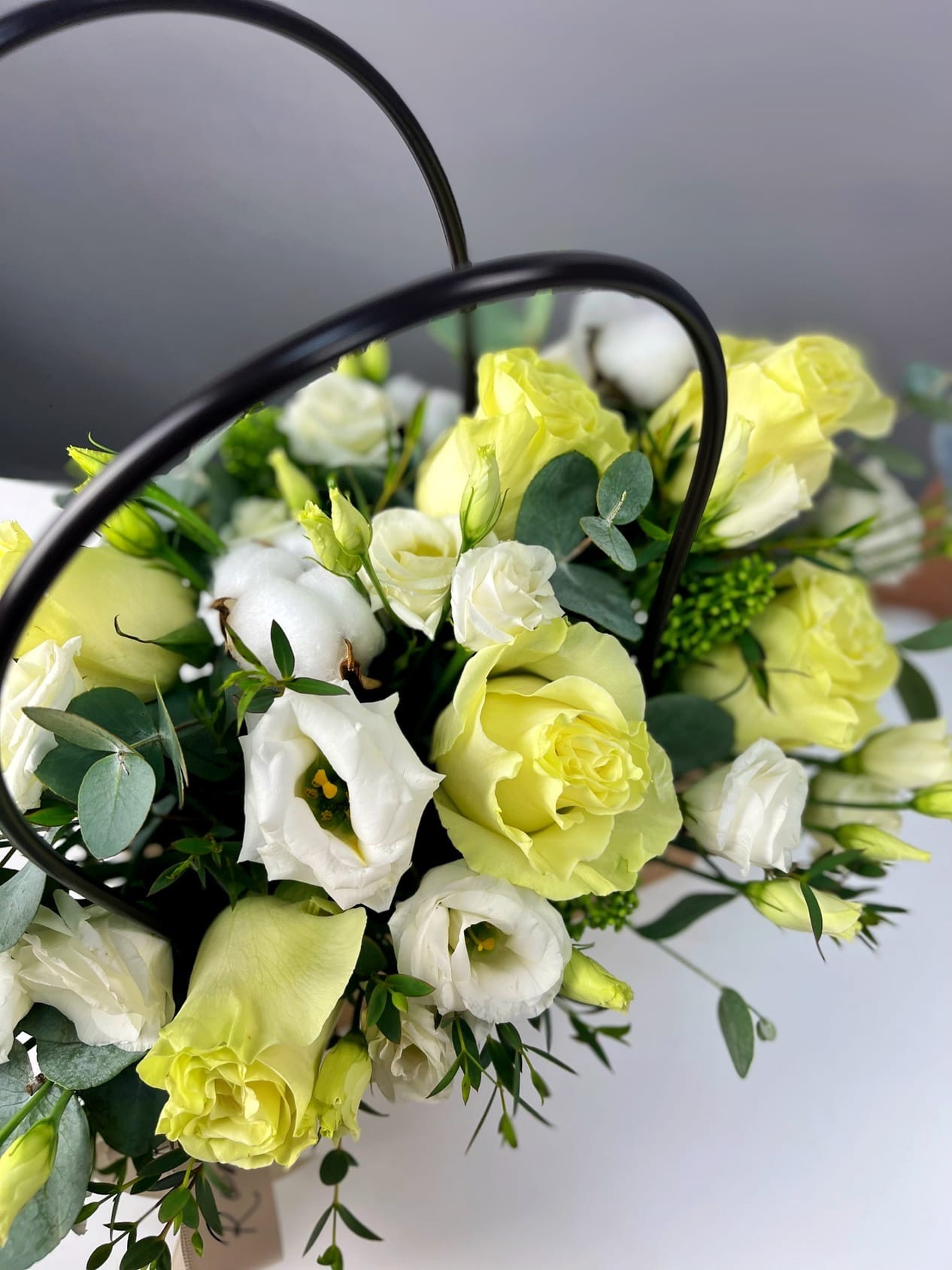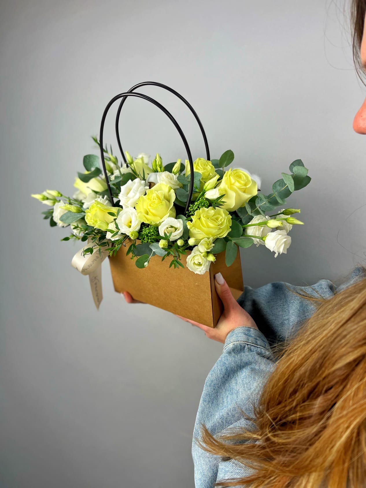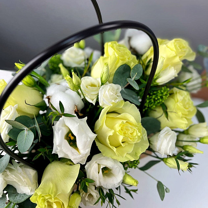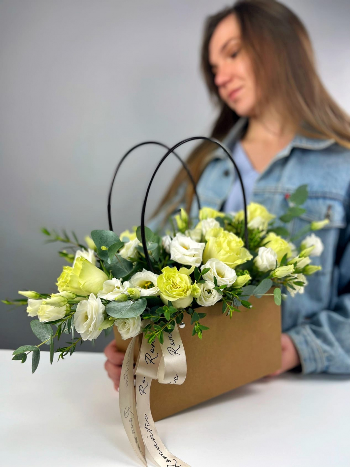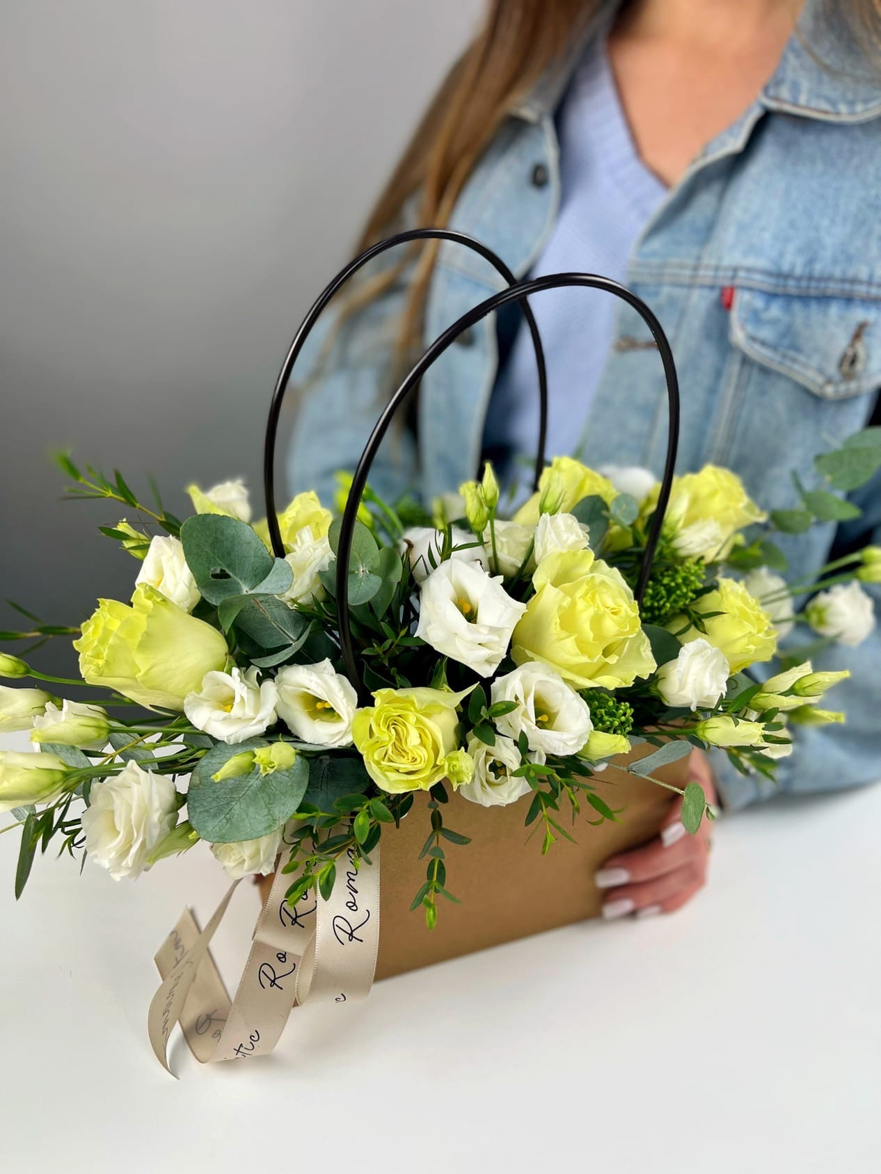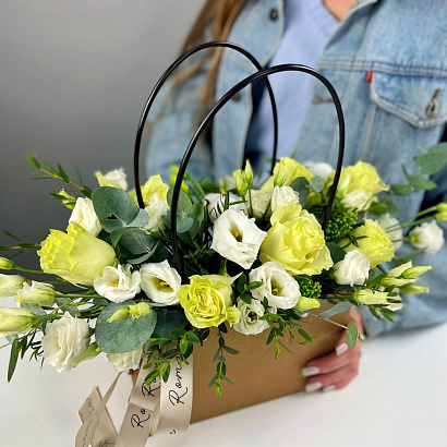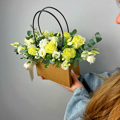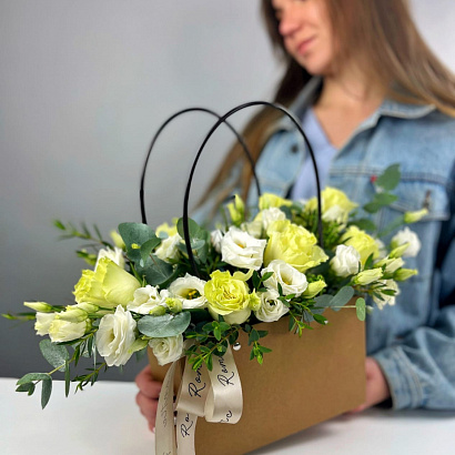 Нежный букет из роз, эустомы и зелени в элегантной сумочке - прекрасный презент для любимой мамы на День матери.