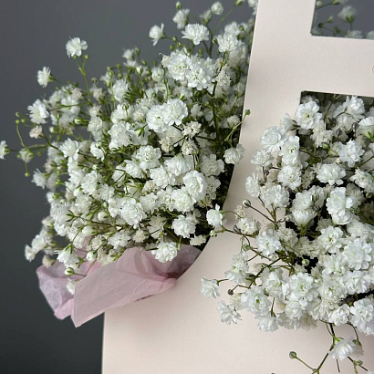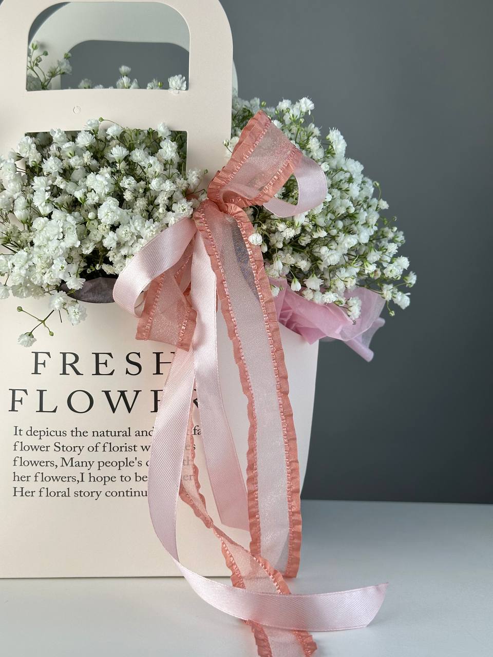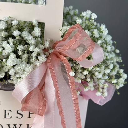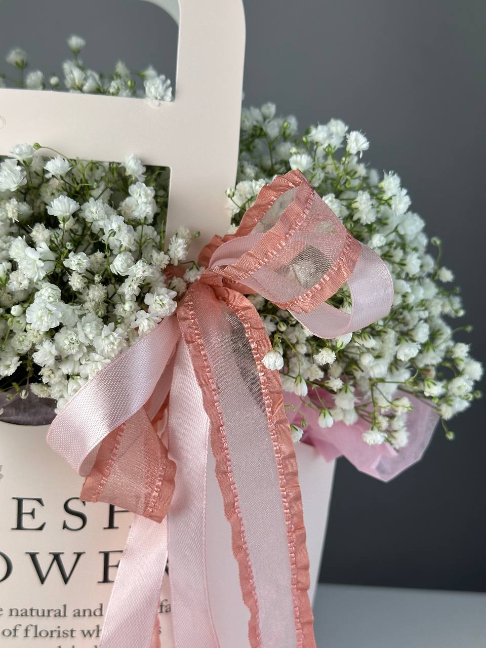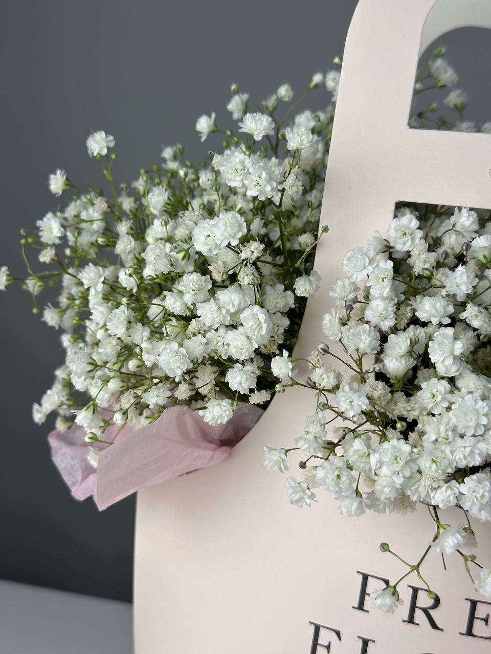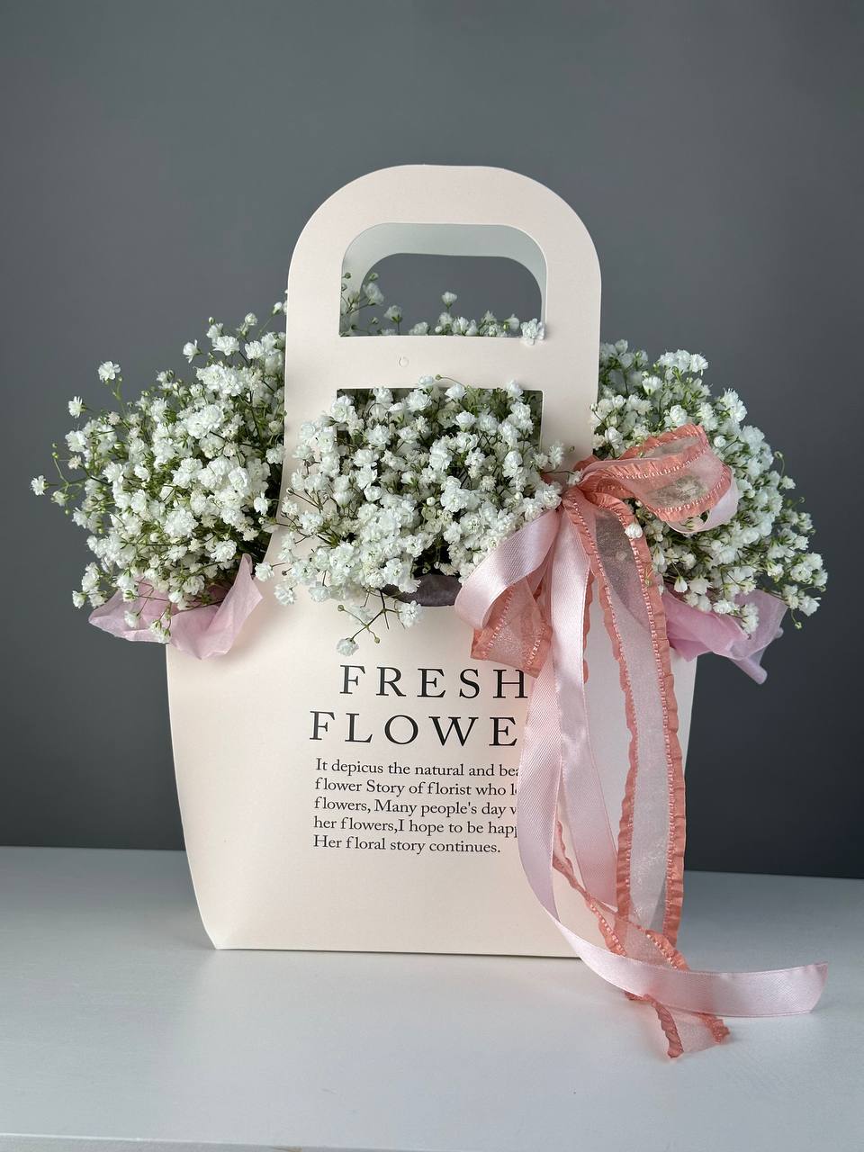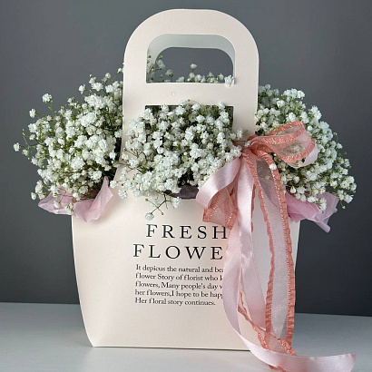 Нарядная и необычная сумочка с белоснежной гипсофилой, украшенная элегантным бантом. На День рождения, на свадьбу или в подарок для самой любимой.
