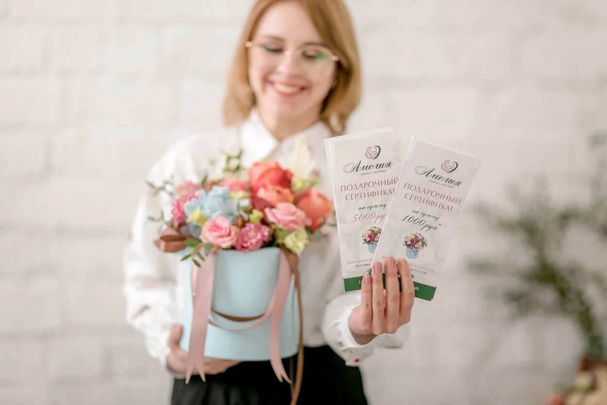 Подарочный сертификат на сумму 3000 рублей. Данный сертификат может быть использован в любом из 9 салонов сети Амелия в Великом Новгороде на покупку цветов, цветочных композиций и букетов, горшечных растений, мягких игрушек и предметов декора.