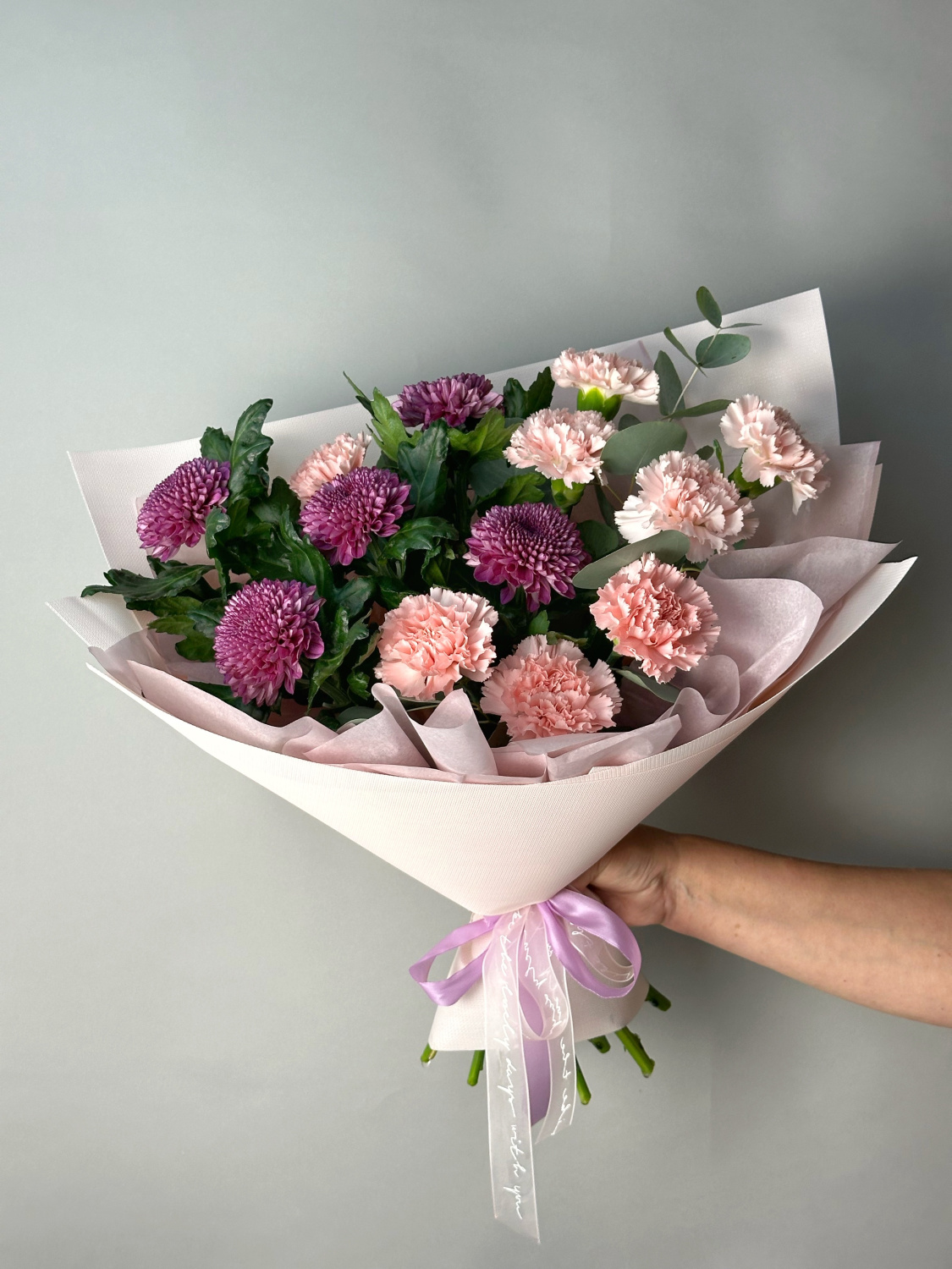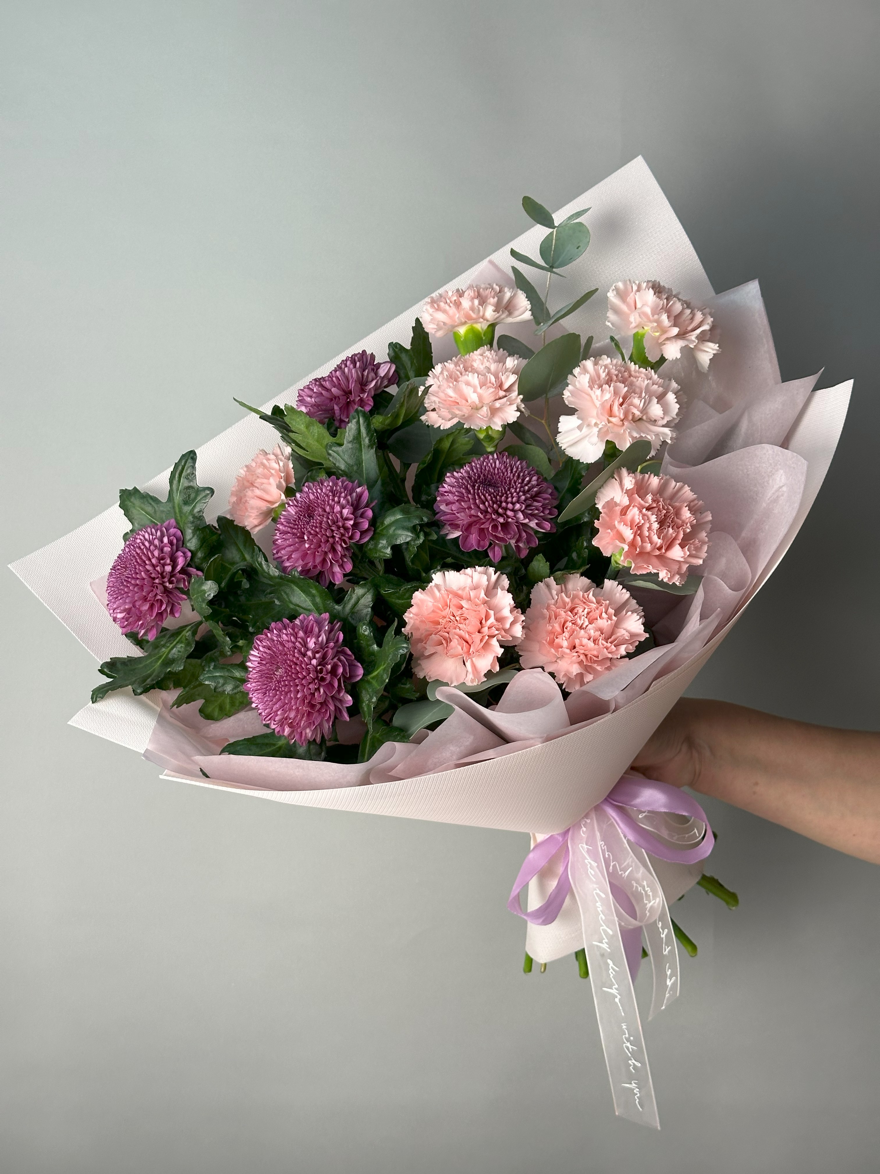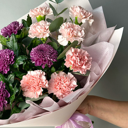 Притягательный букет из ярких хризантем и нежных гвоздик, оформленный эвкалиптом. Прекрасный презент, который украсит любой праздник!