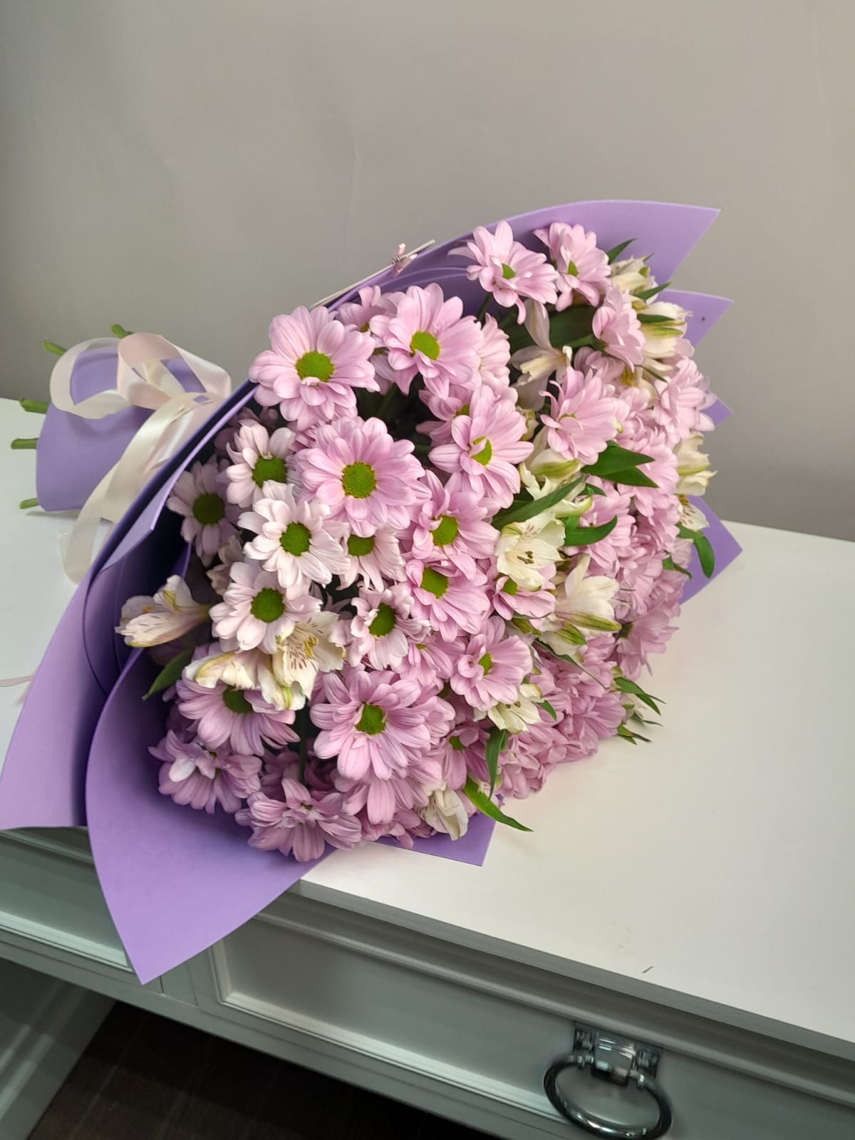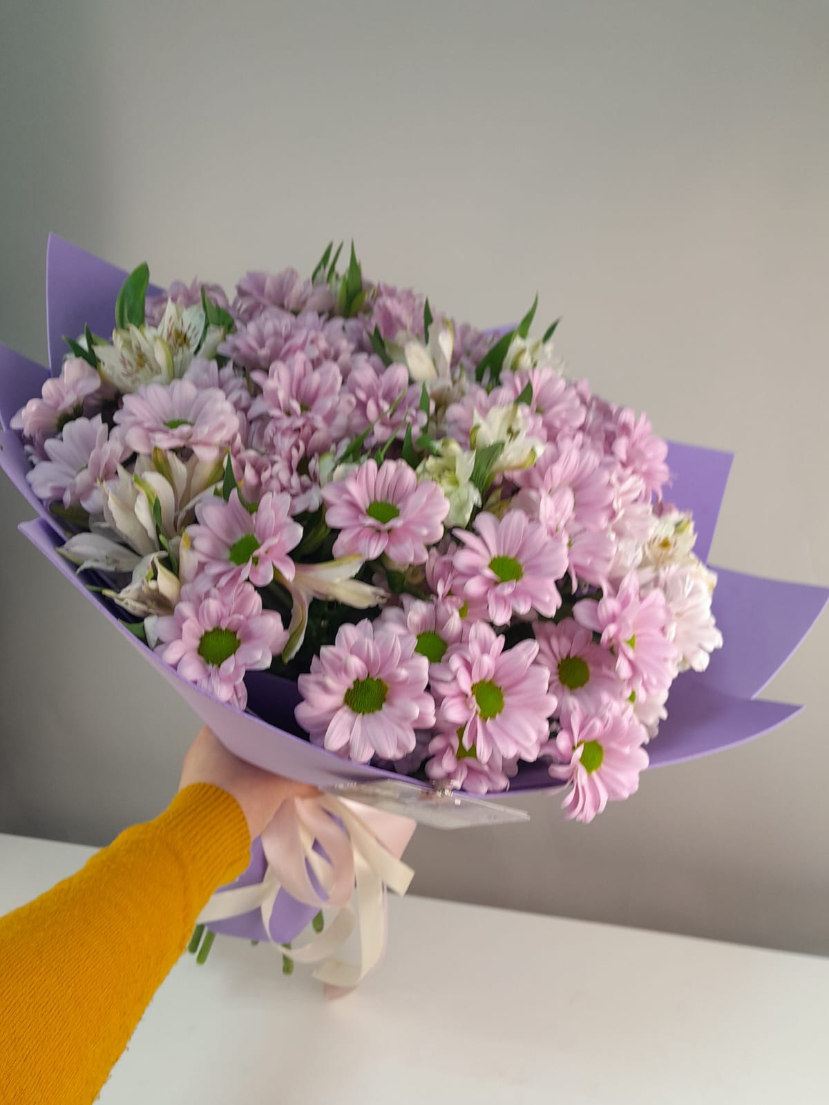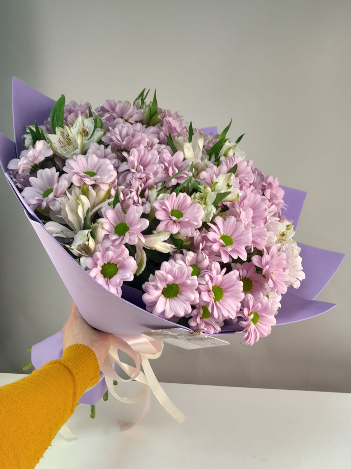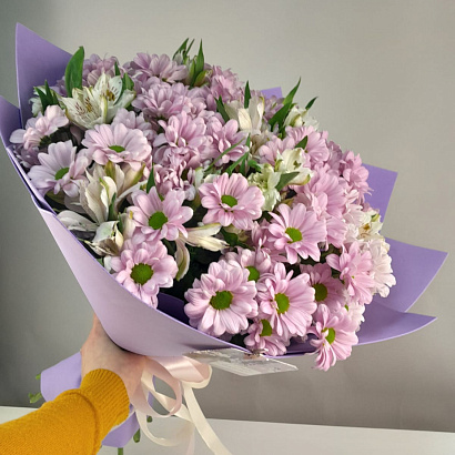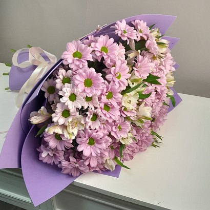 Изысканный гармоничный букет из розовых хризантем и альстромерий.