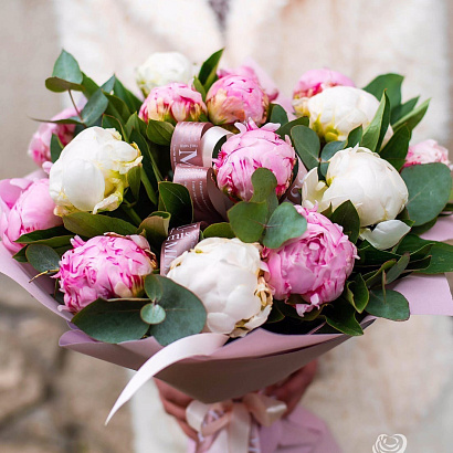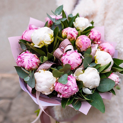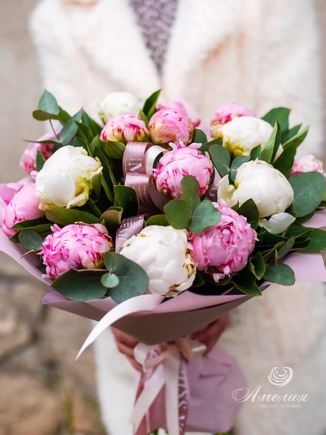 Букет из 15 белых и розовых пионов и веточки эвкалипта - отличный презент на день рождения или юбилей. Или как знак внимания! Лучшие сорта пионов в салонах Амелия! Дарите цветы!