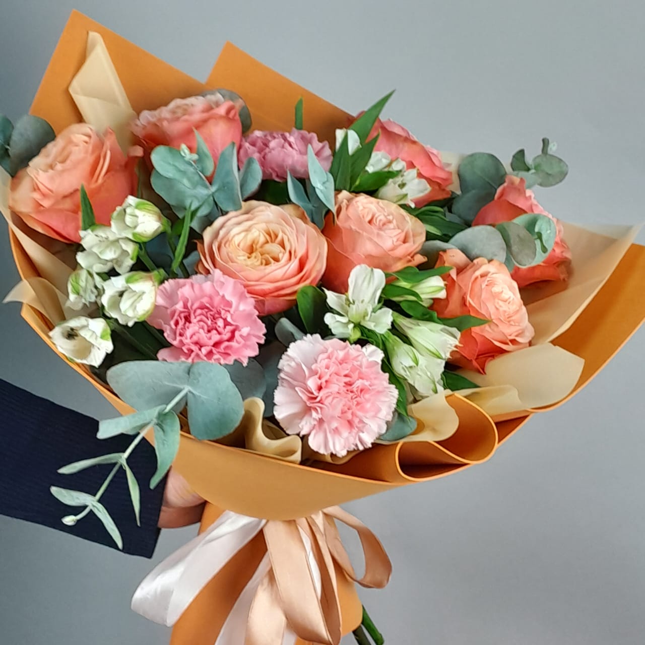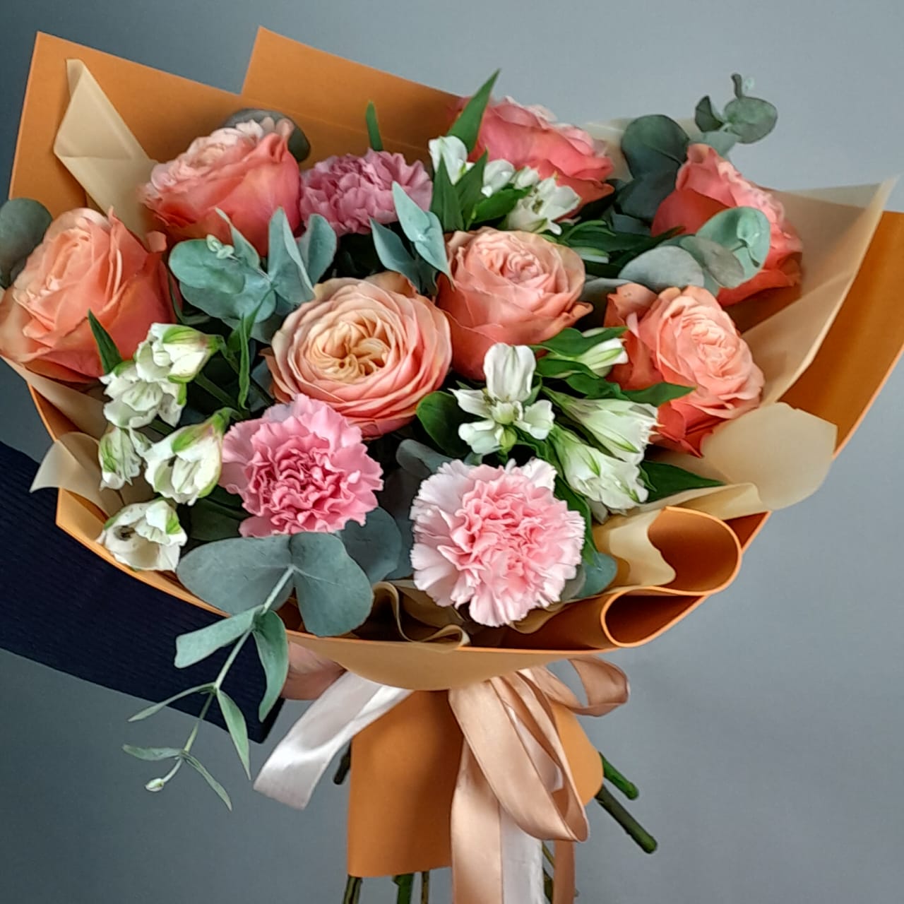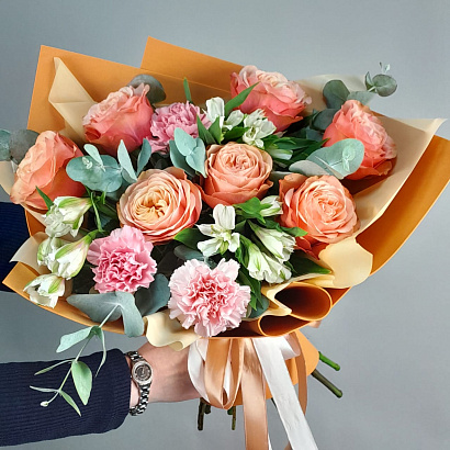 Розовые мечты должны сбываться! Букет из прекрасных розовых роз, альстромерий, гвоздик и эвкалипта несомненно доставит радость получателю! Дарите эмоции вместе с букетами из салонов Амелия в Великом Новгороде.