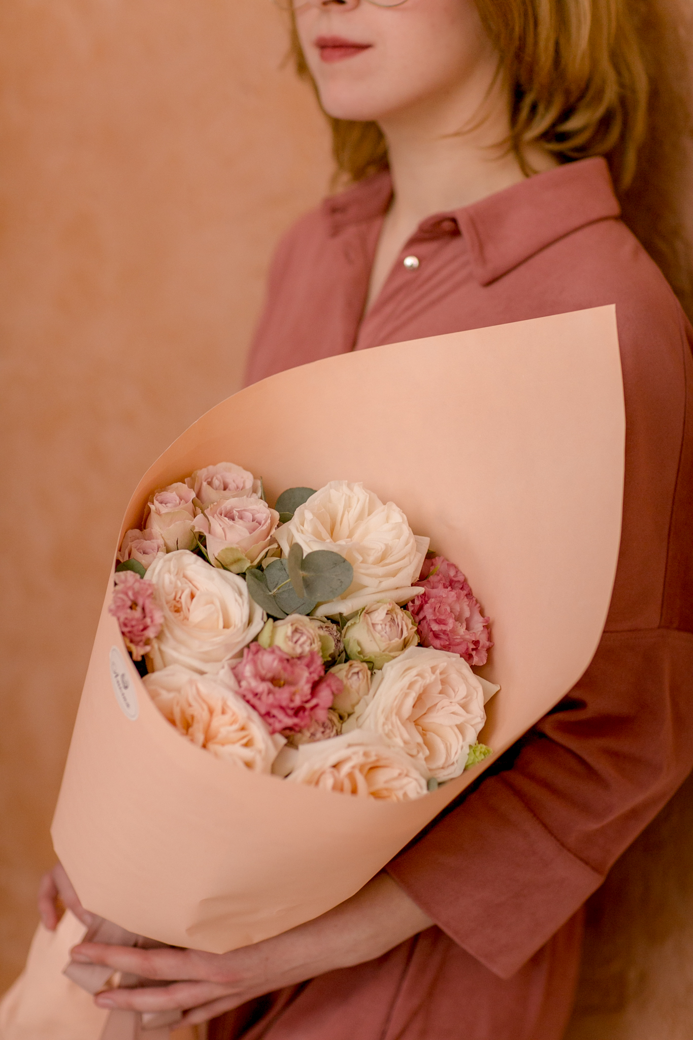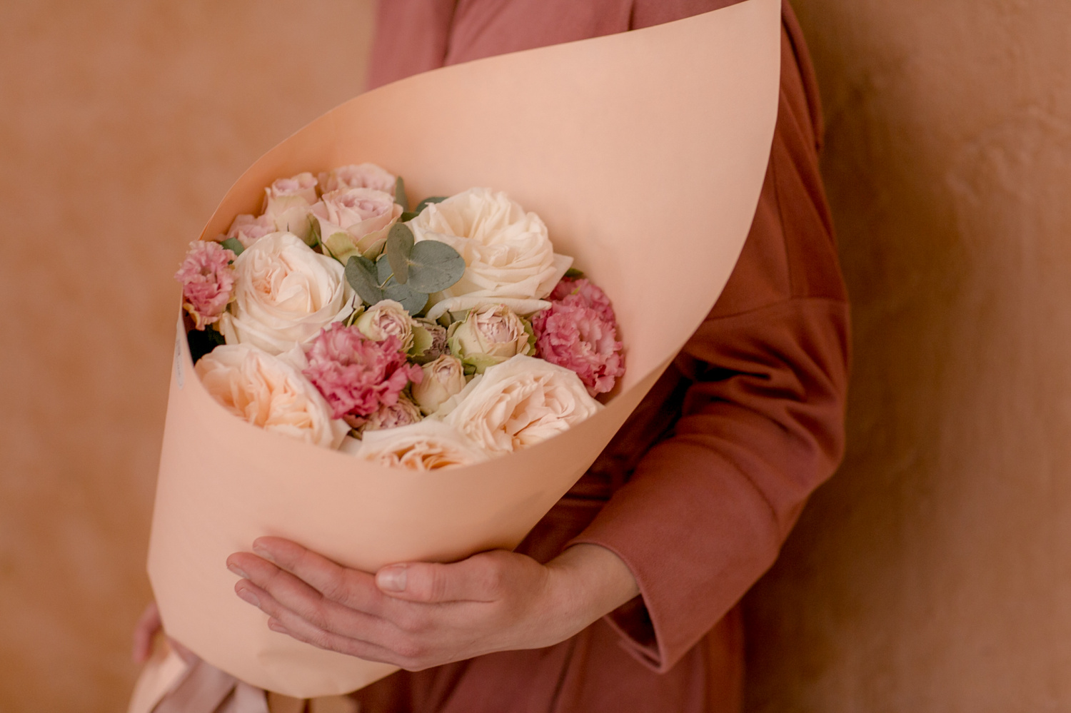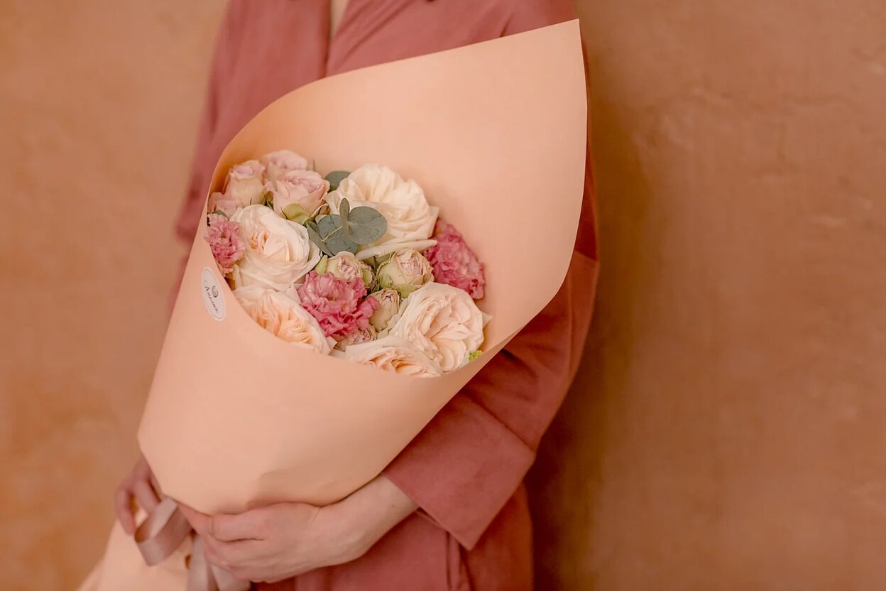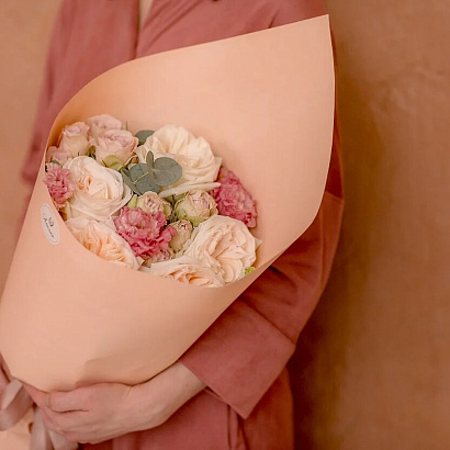 Восхитительный кулёчек из роз Вайт Охара, кустовых роз, махровой эустомы и эвкалипта. Дарите цветы и эмоции.